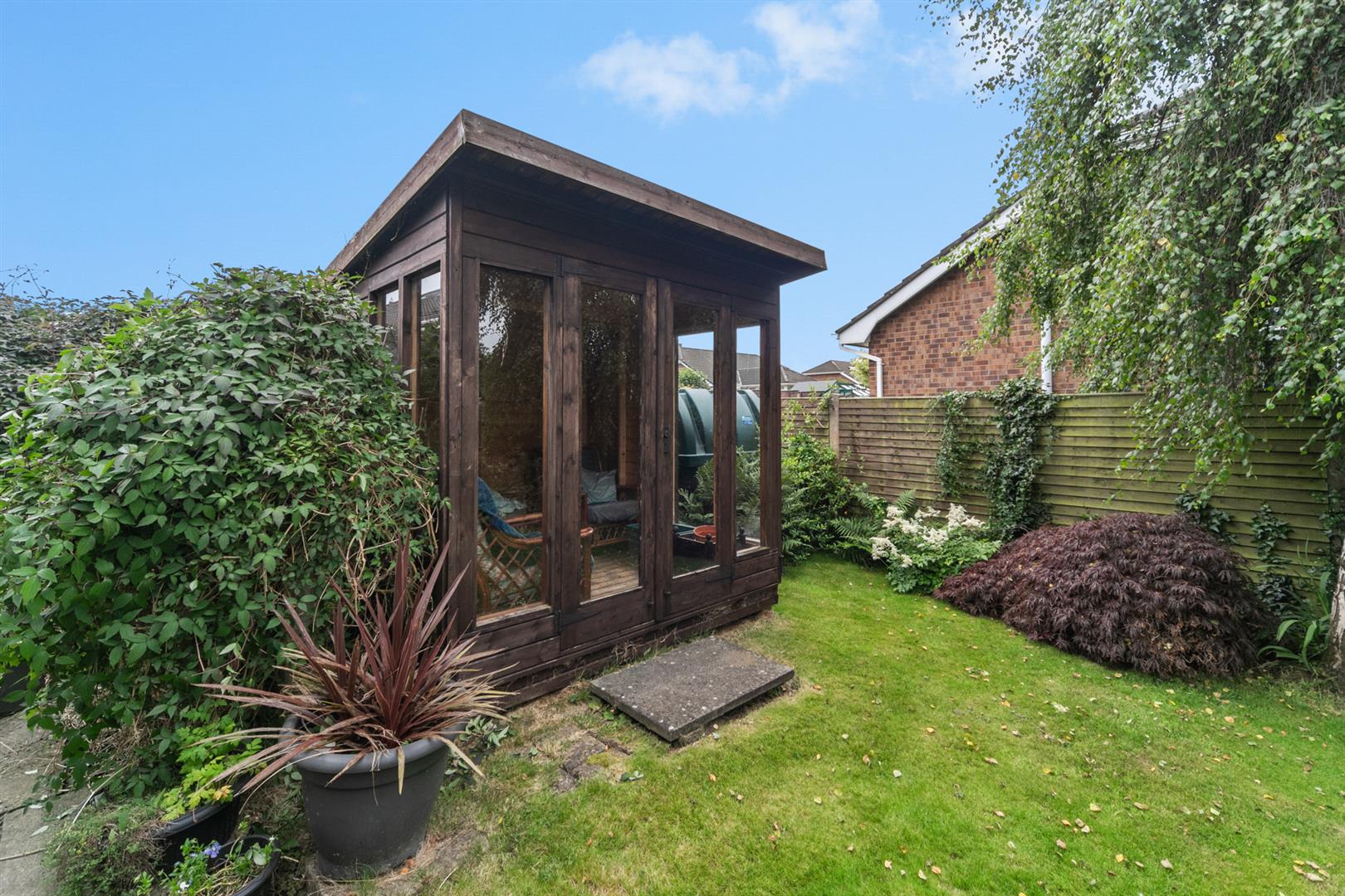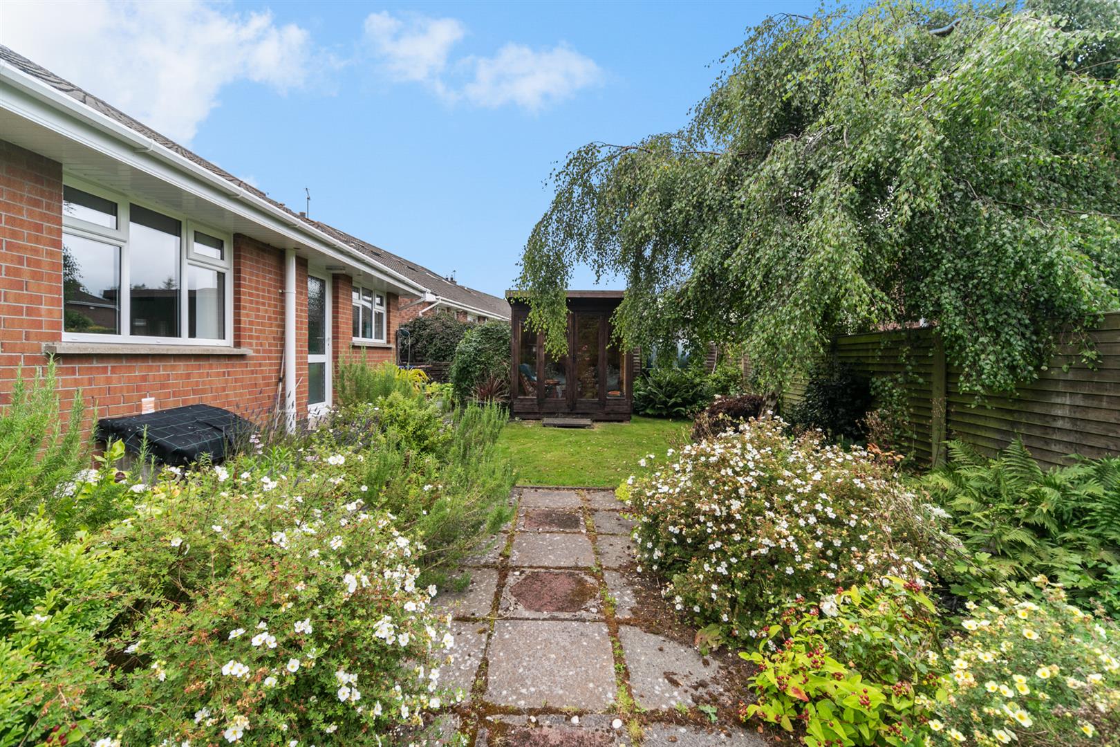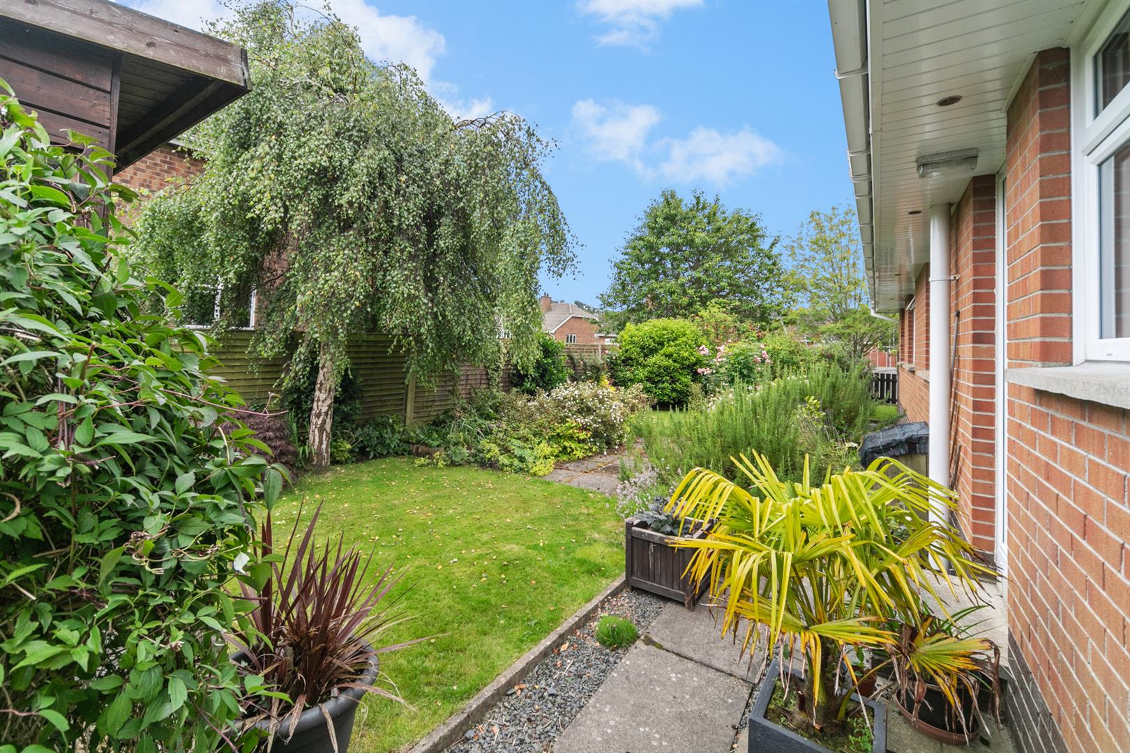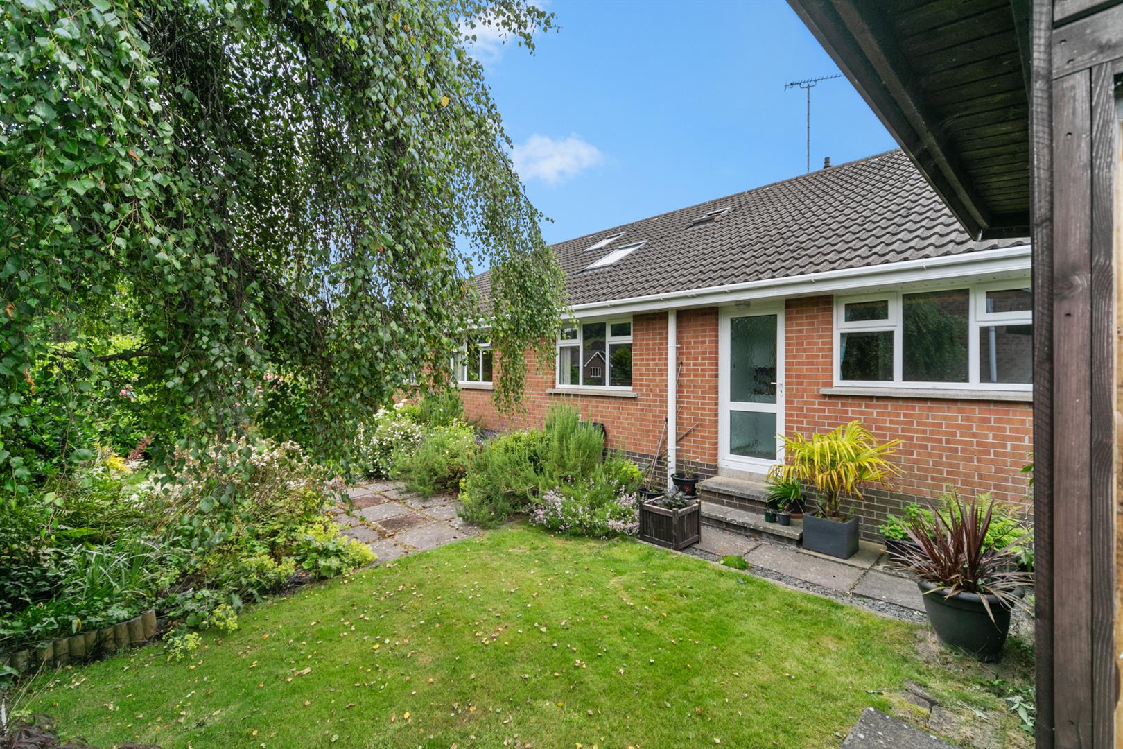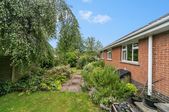 To the front is a good sized garden laid out in lawns with mature plantings and ample off street parking. To the rear is a paved patio area and an abundance of plantings and lawn area.