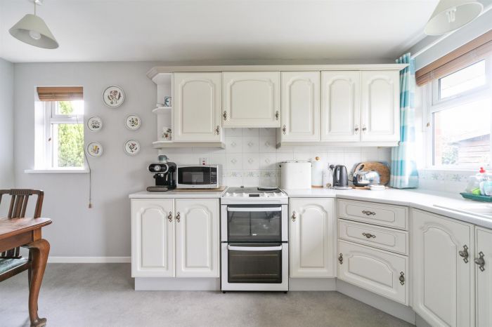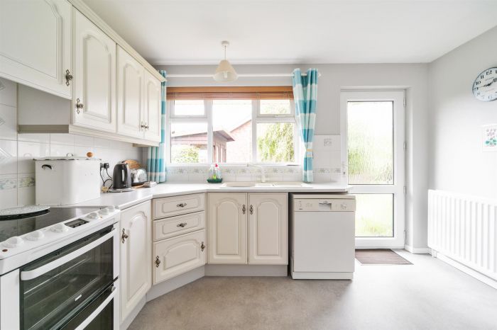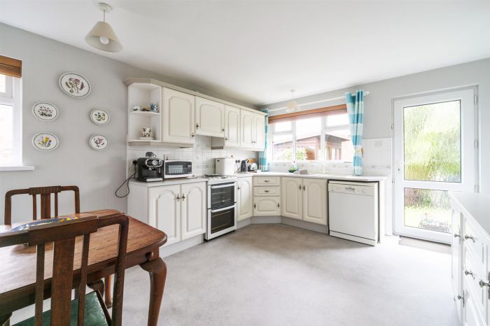 A range of high and low level unit including sink unit and integrated extractor fan. Integrated fridge. Recess for oven and fridge. Dishwasher. Tiled splash area. Door to garage and rear.