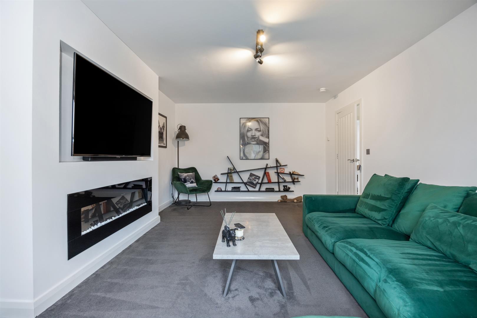 Bright spacious living room with feature electric fireplace and space for wide screen tv.