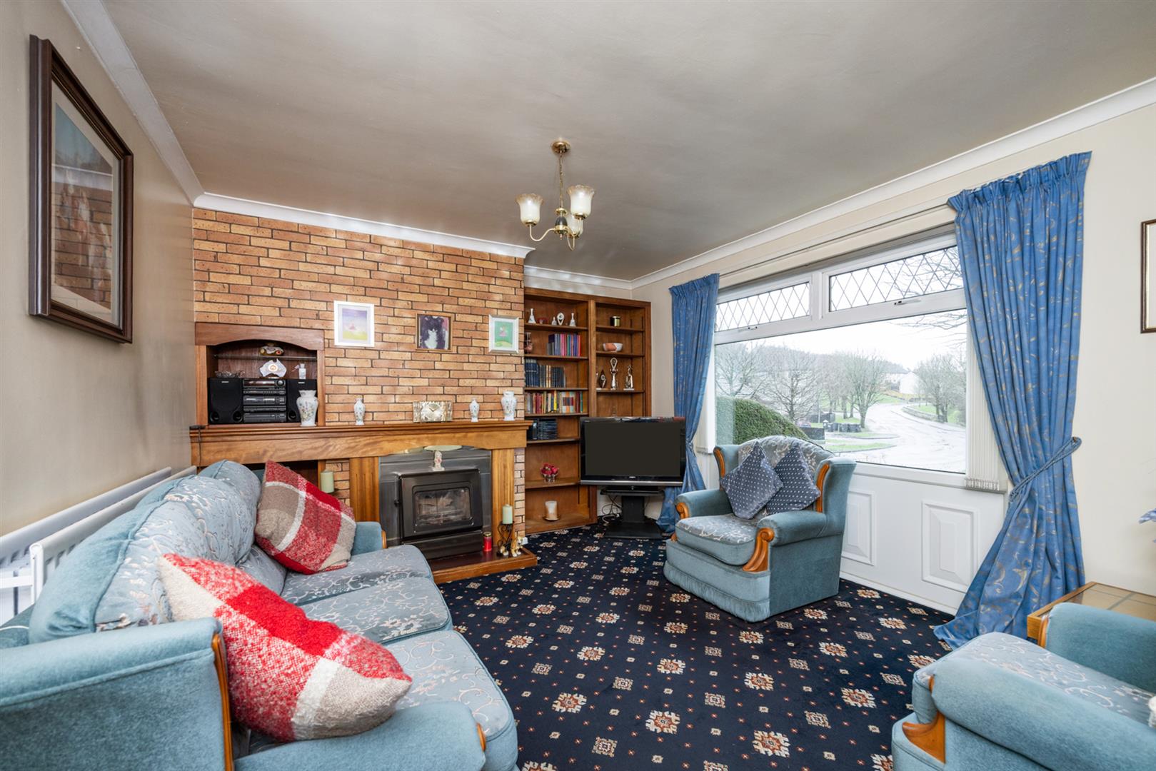 Front facing living room with feature fireplace.