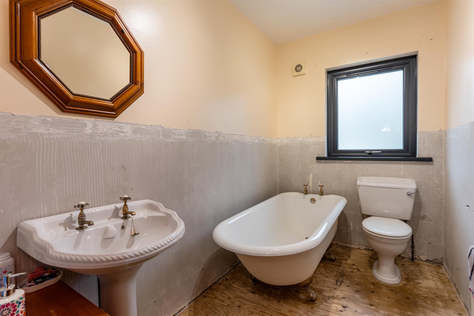 White suite encompassing roll top bath; low flush W/C and wash hand basin.
