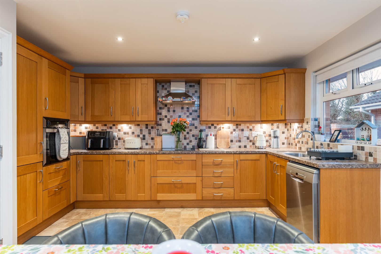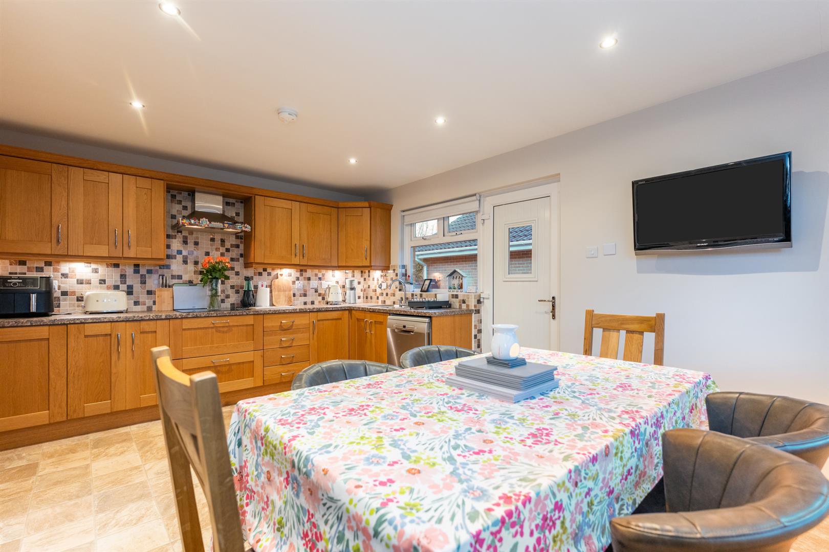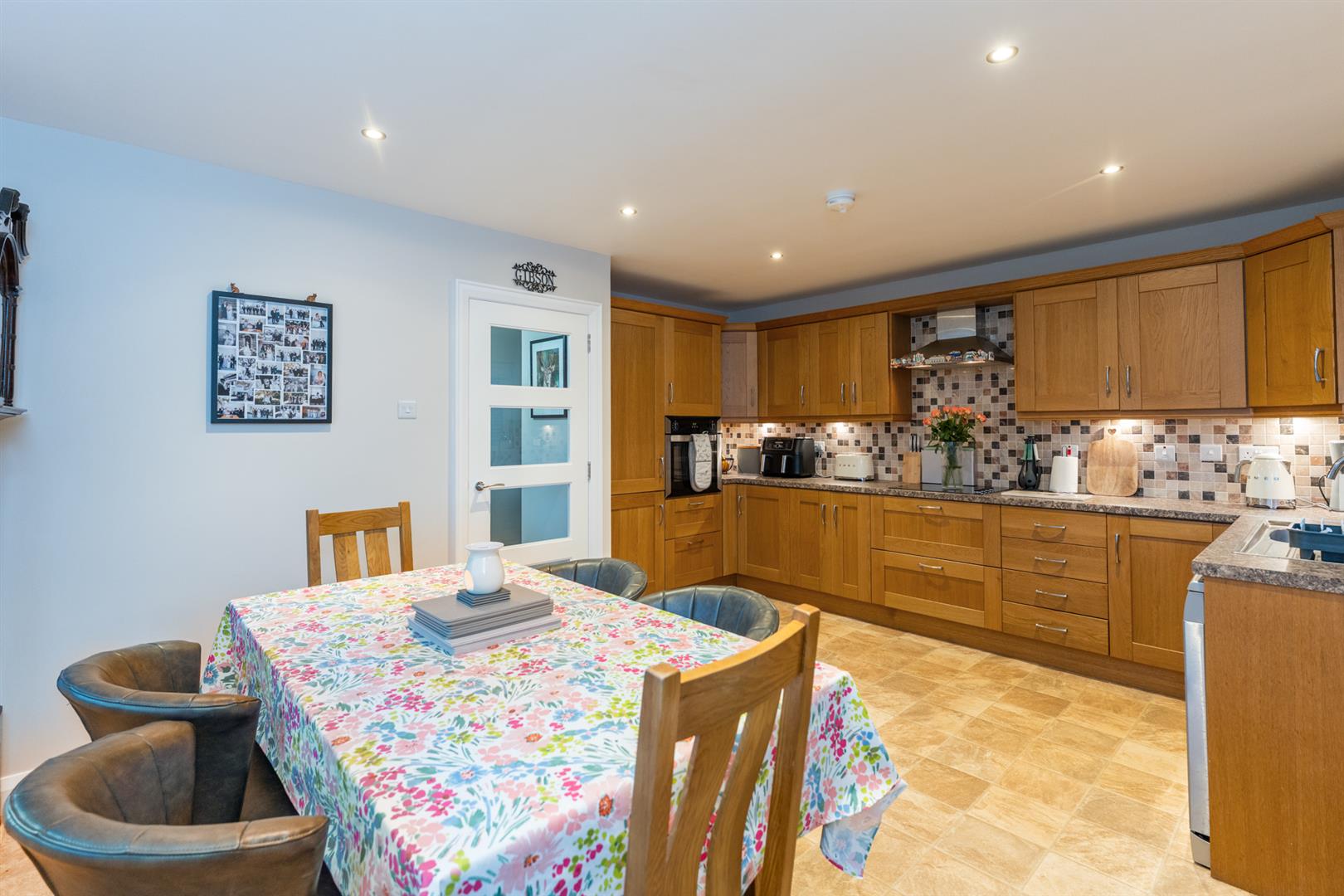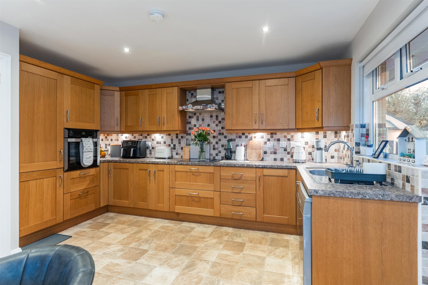 A range of high and low level units incorporating stainless steel sink unit, integrated oven and hob, stainless steel extractor fan, space for dishwasher, plumbed for washing machine, integrated fridge freezer. Wall tiling. Door to side.