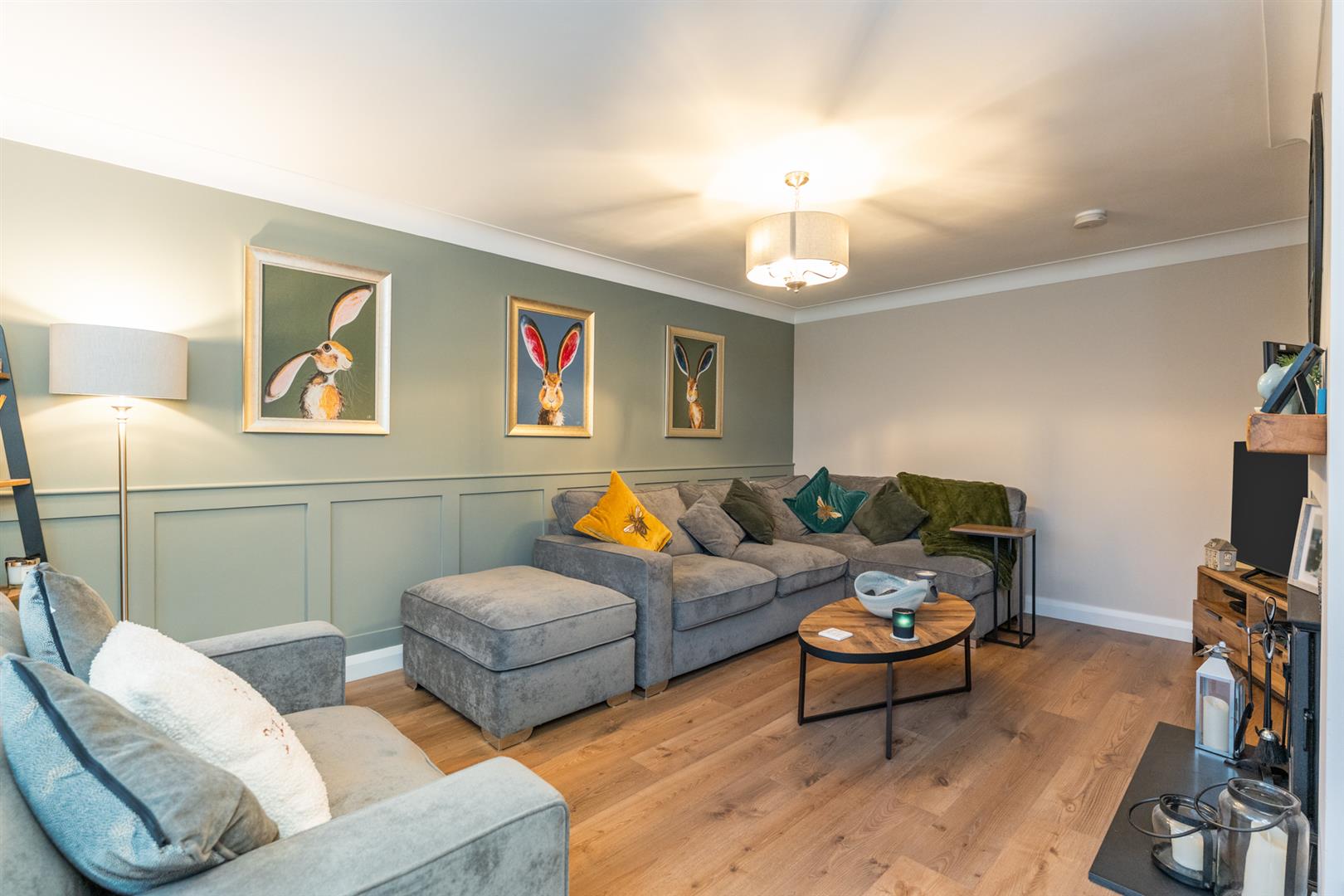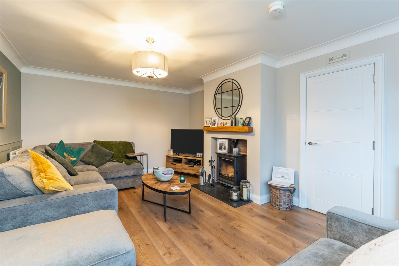 Wooden laminate flooring. Cornicing. Feature fireplace with multi fuel stove.