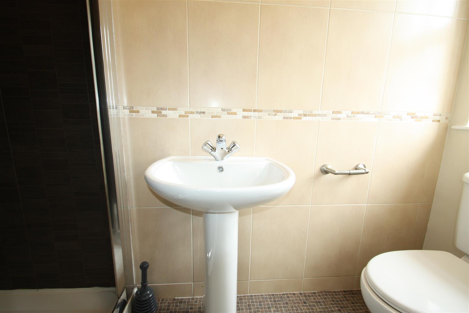 White suite comprising low flush w.c, wash hand basin and shower cubicle. Tiled splash area.