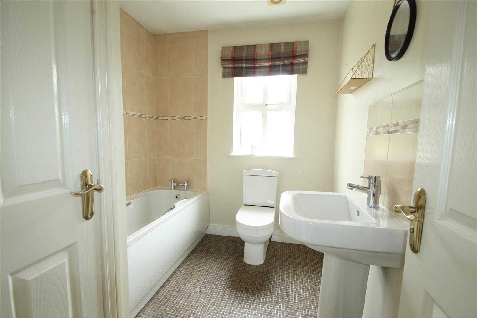 White suite comprising low flush w.c, wash hand basin and panel bath with overhead shower. Tiled splash area.