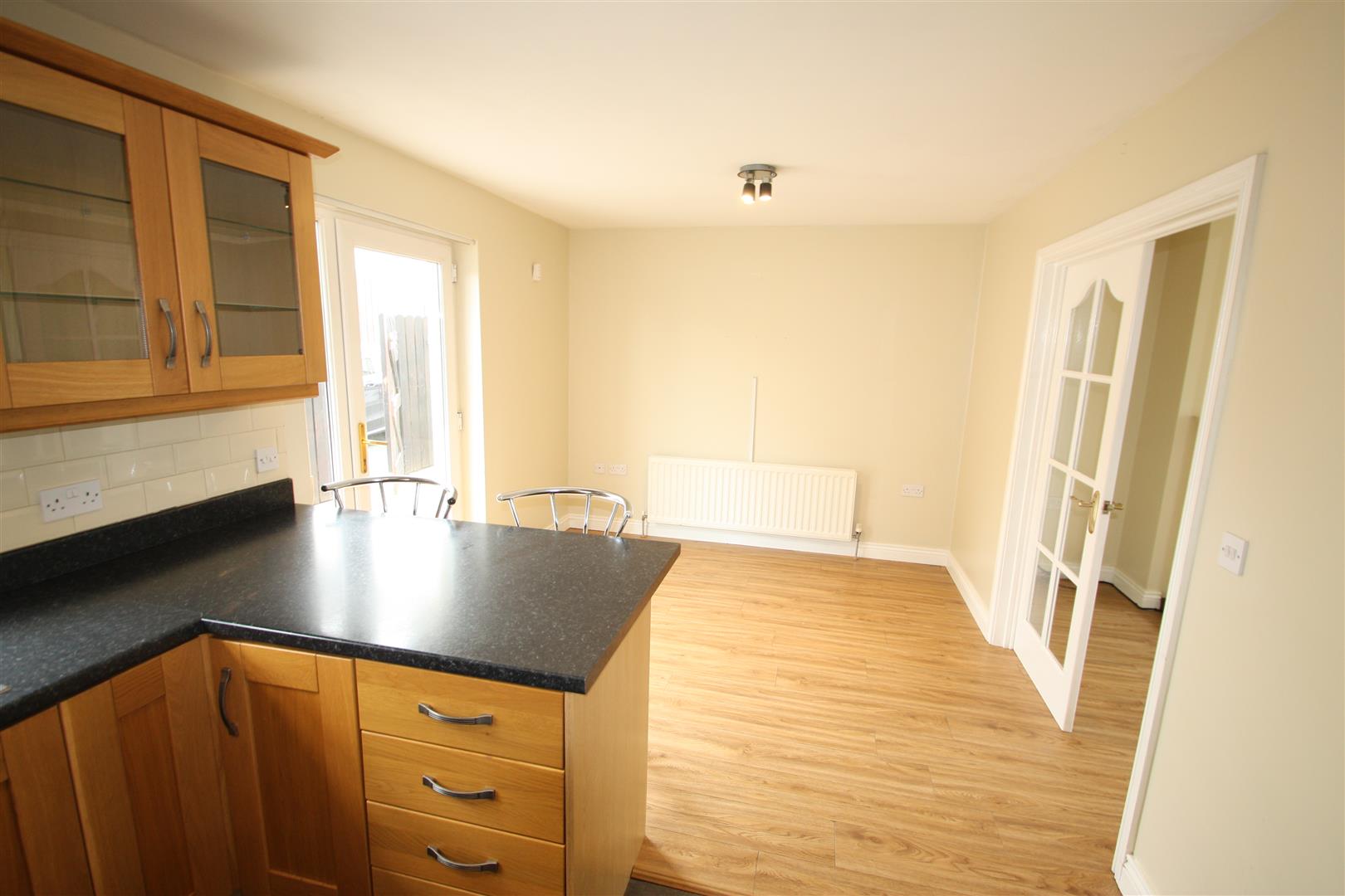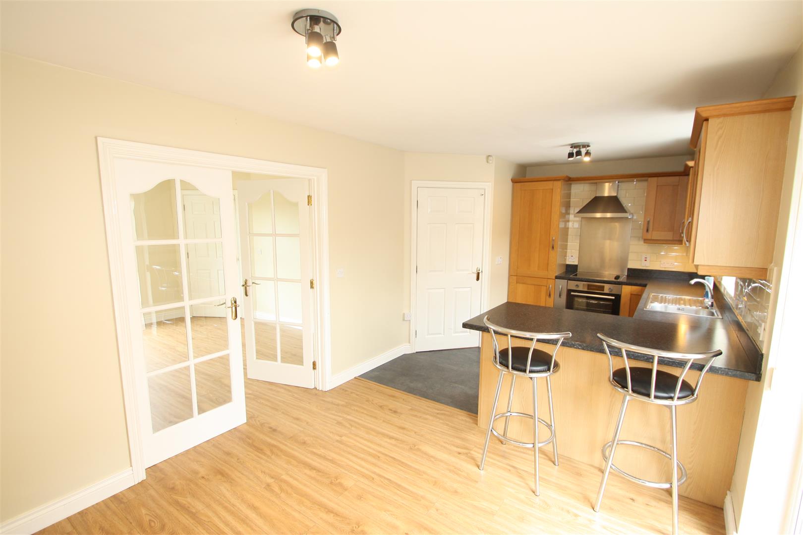 A range of high and low level units including stainless steel sink unit, integrated oven, hob and fridge freezer. Breakfast bar. Tiled splash area. Door to rear.