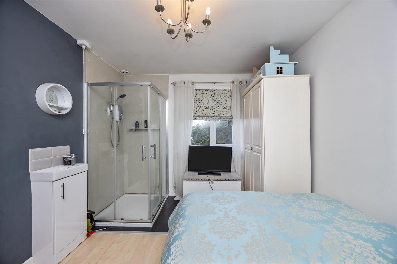 Rear facing. Corner shower and vanity sink unit.