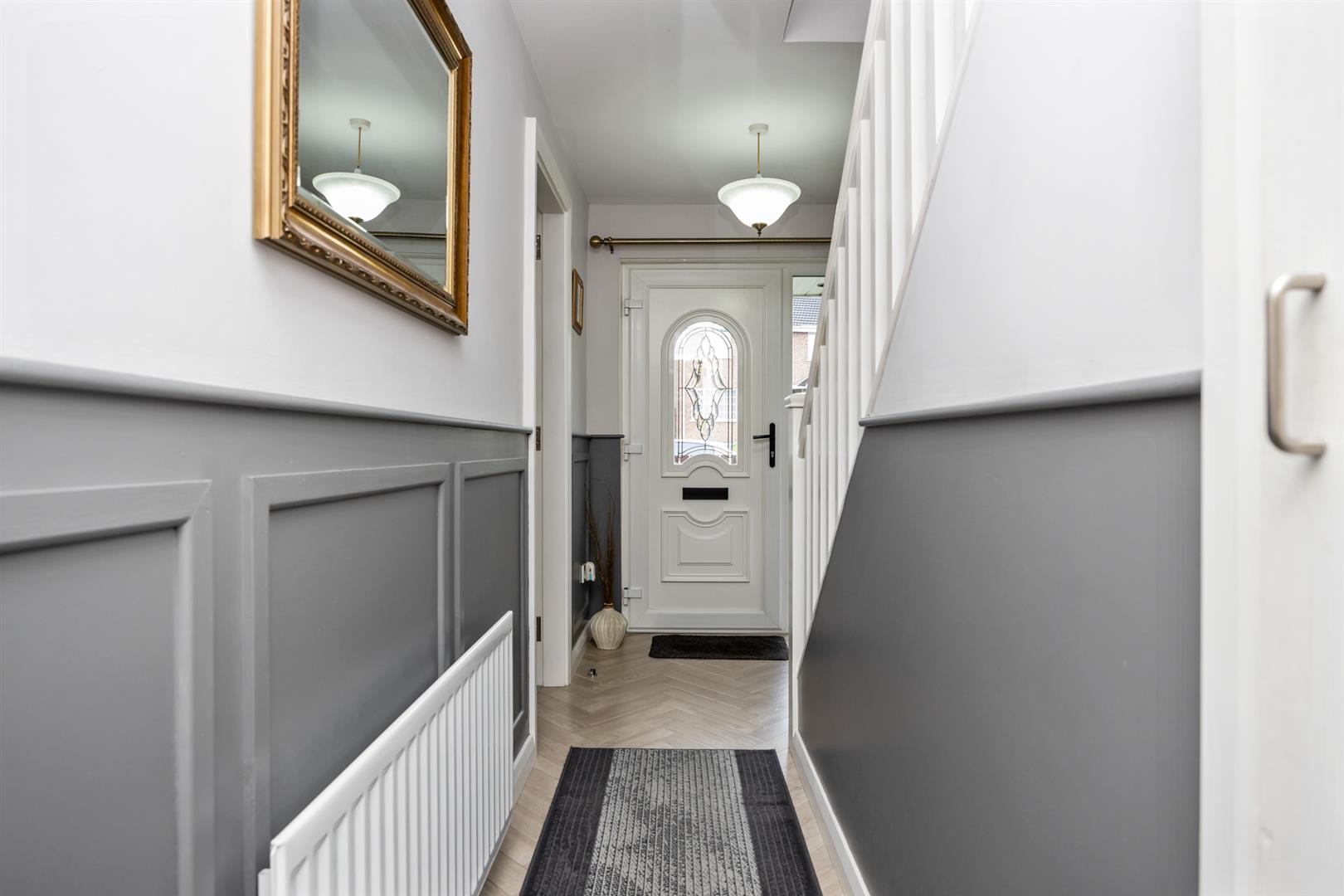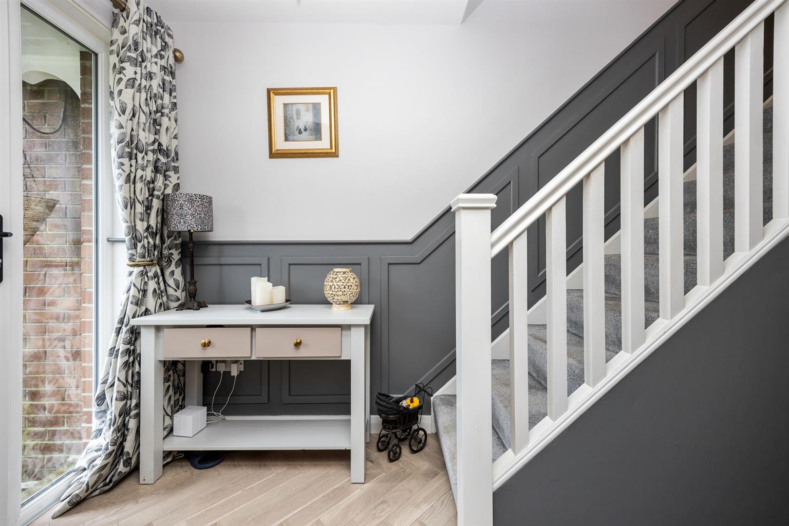 PVC glazed front door and side panel window into bright entrance hall with parquet style flooring and feature wall paneling. Access to storage cupboard.