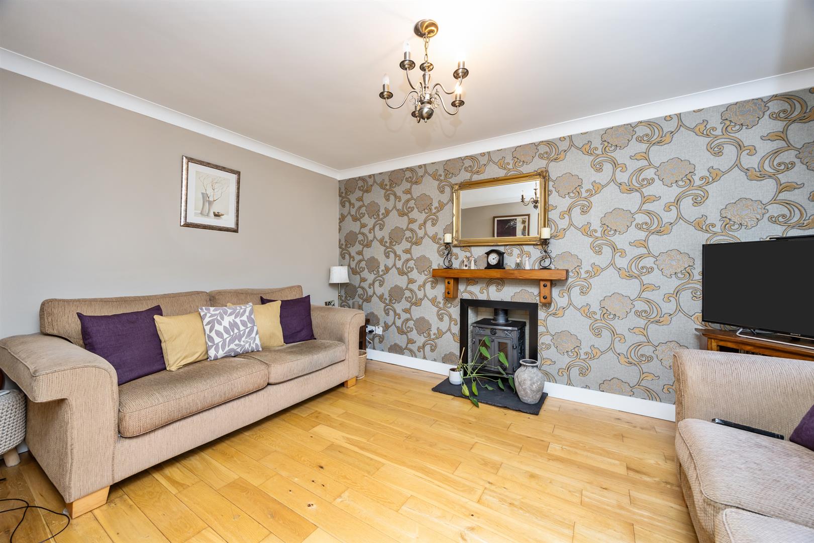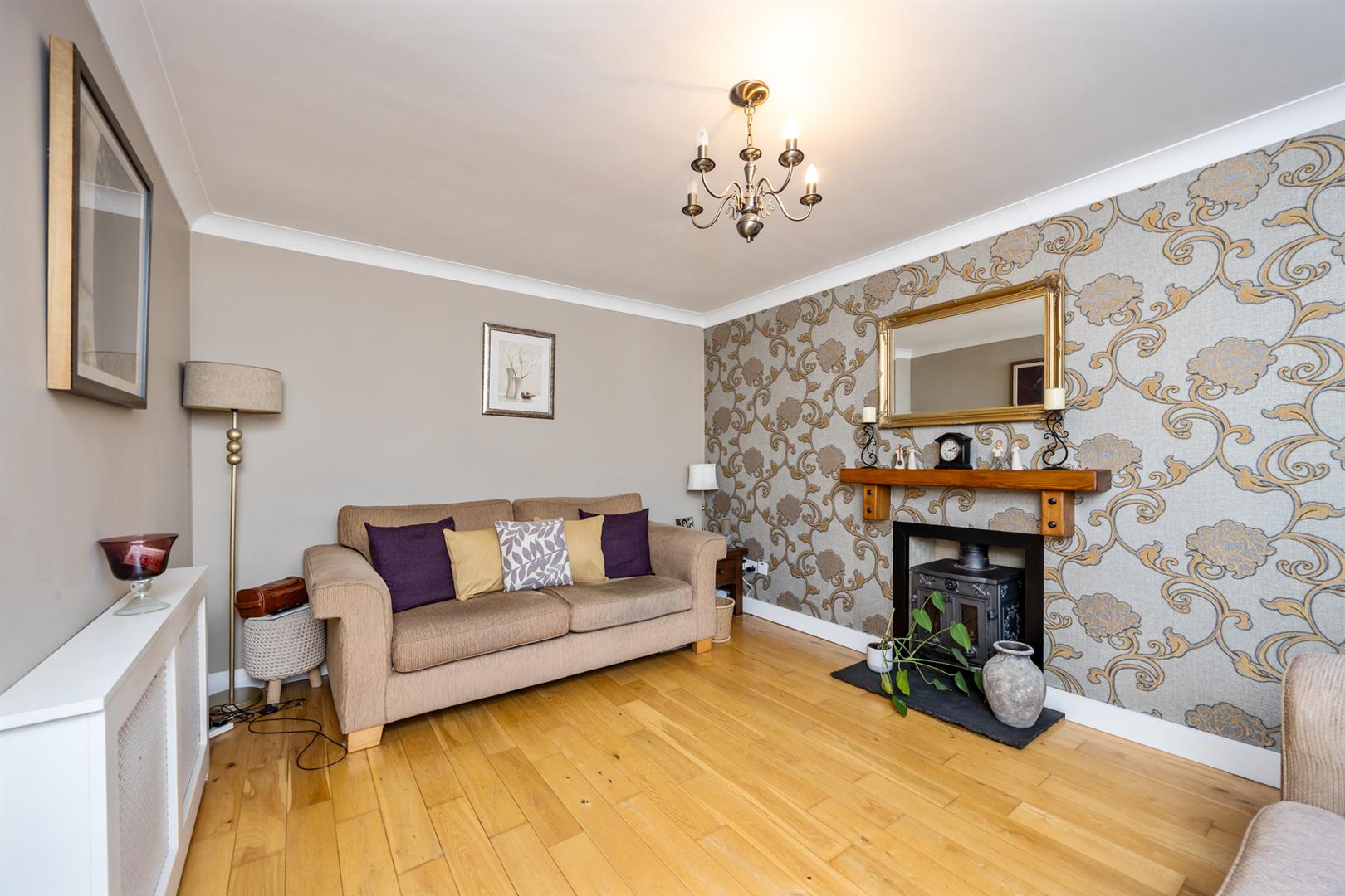 Feature fireplace with wood burning stove and feature wooden mantle. Wooden flooring and ceiling cornicing.