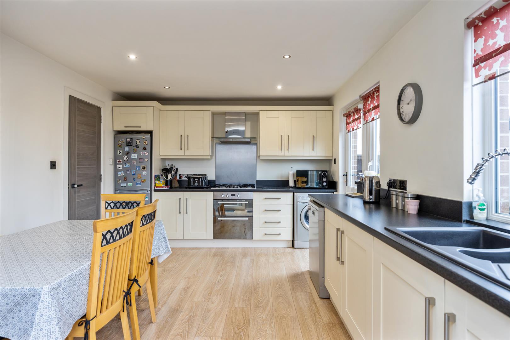 Range of high and low rise units with integrated sink and drainer. Electric oven and hob with stainless steel extractor fan. Recess for fridge/freezer; washing machine and dish washer. Space for dining. Door to rear and sliding patio doors to wooden decking area ideal for outside entertaining.