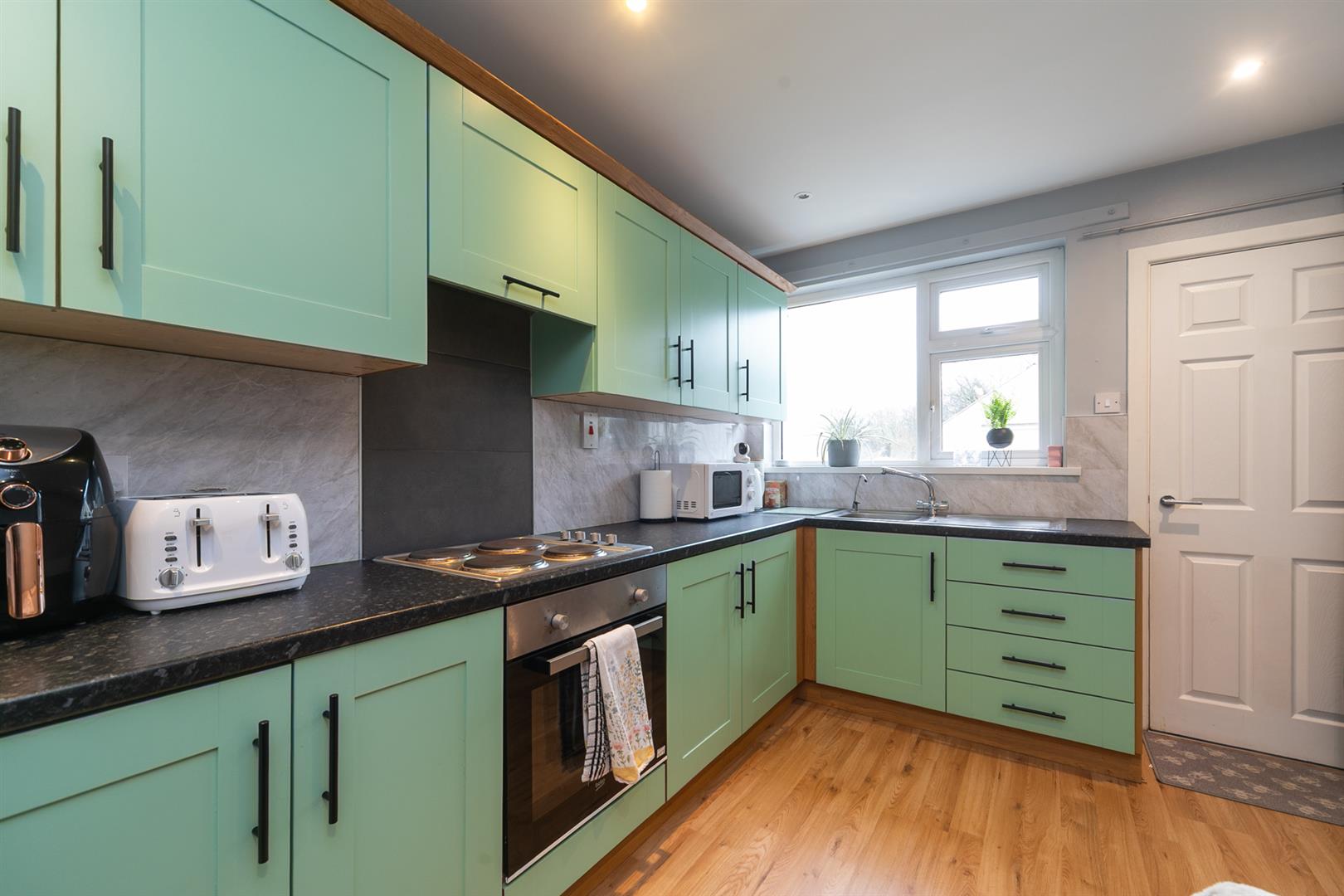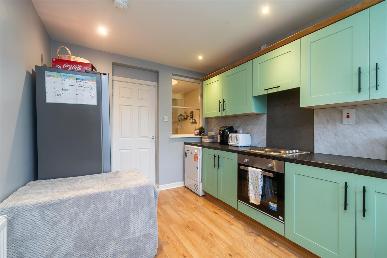 A range of high and low level units including integrated oven and hob, space for fridge freezer, space for tumble dryer, extractor fan. Wooden laminate flooring and tiled splash.