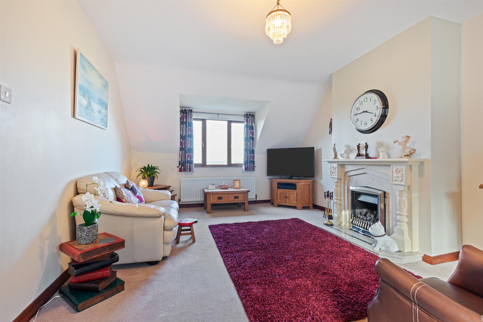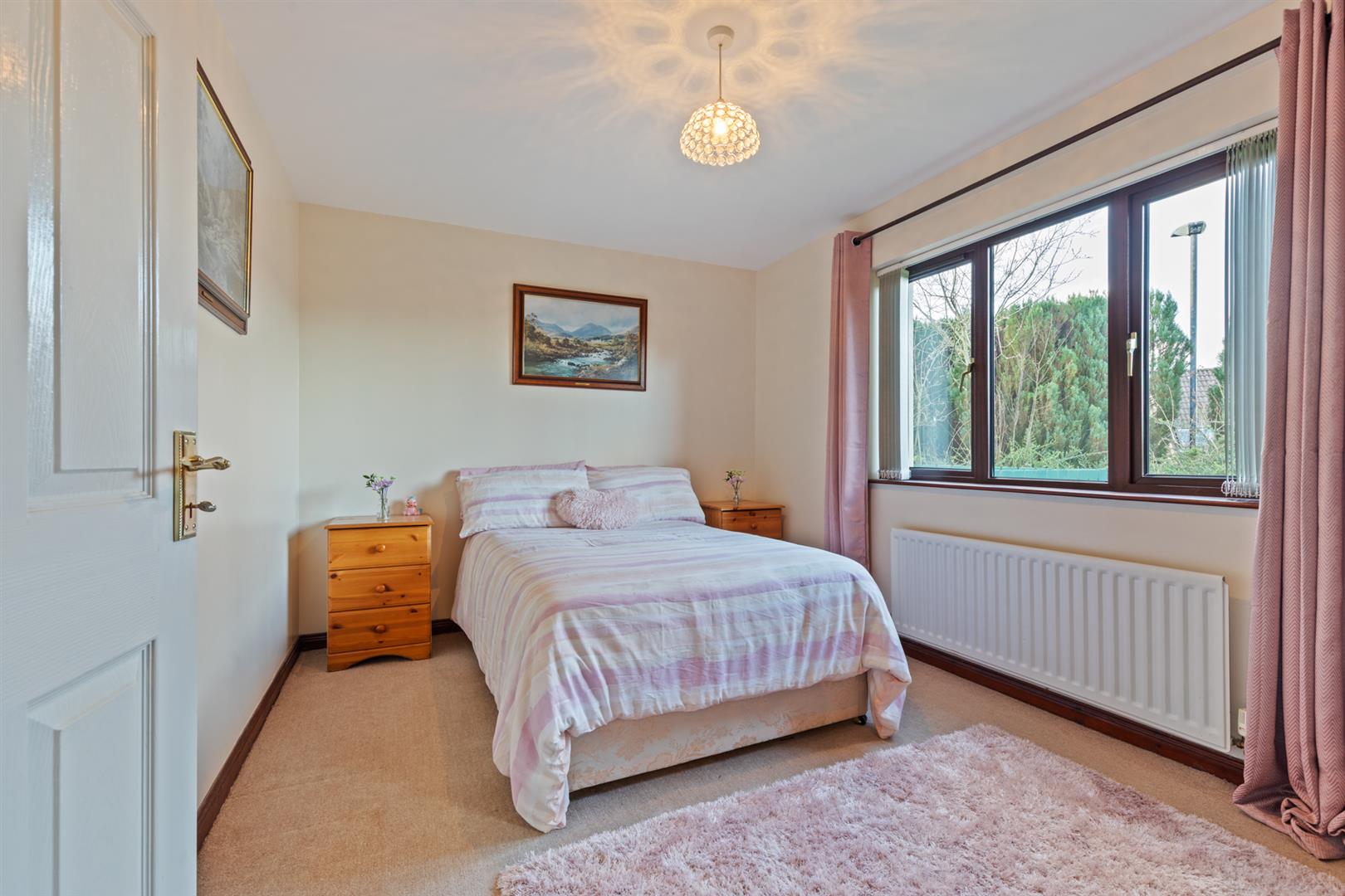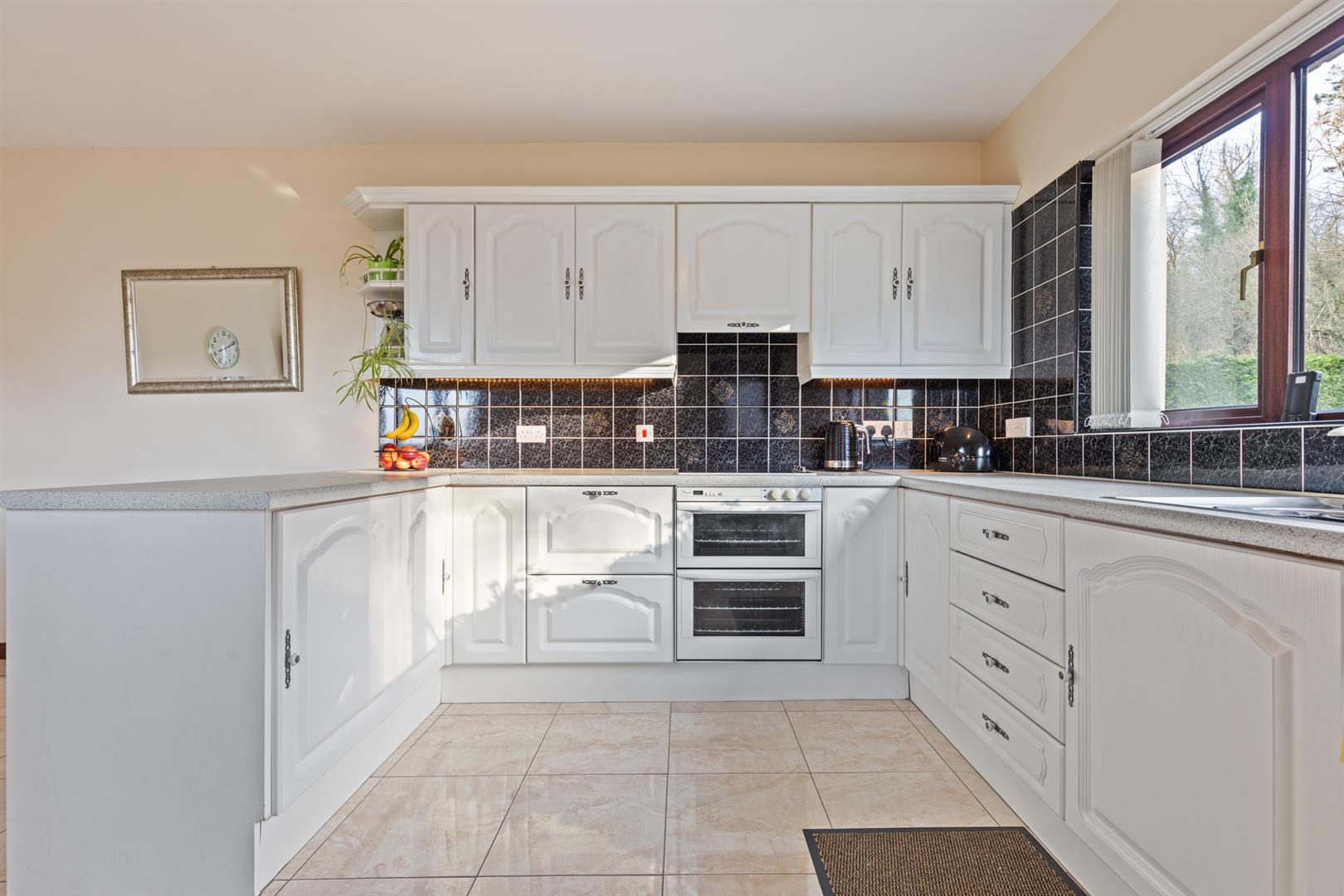 Externally, this home continues to impress. There is a garage and a large brick-paved driveway offering ample parking for multiple vehicles or a caravan. To the rear, a private patio area enjoys fantastic elevated views over Ballynahinch, creating the perfect setting for outdoor dining and relaxation. The enclosed garden is laid out in neat lawns, ideal for families and those seeking outdoor space.