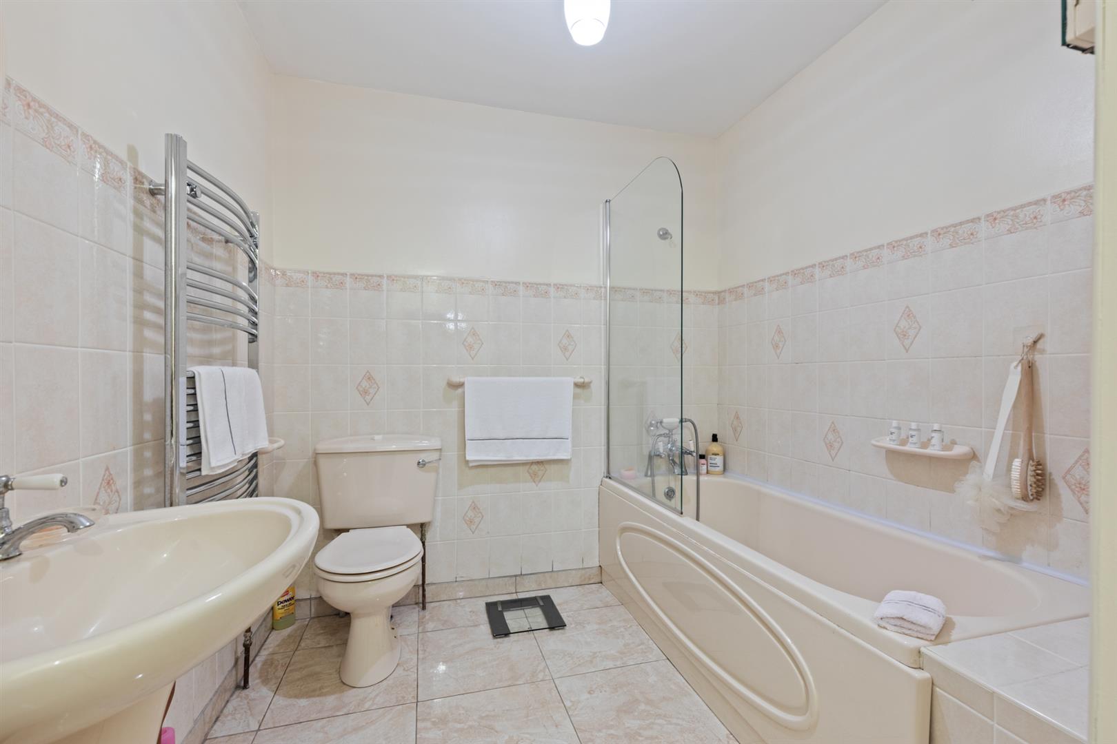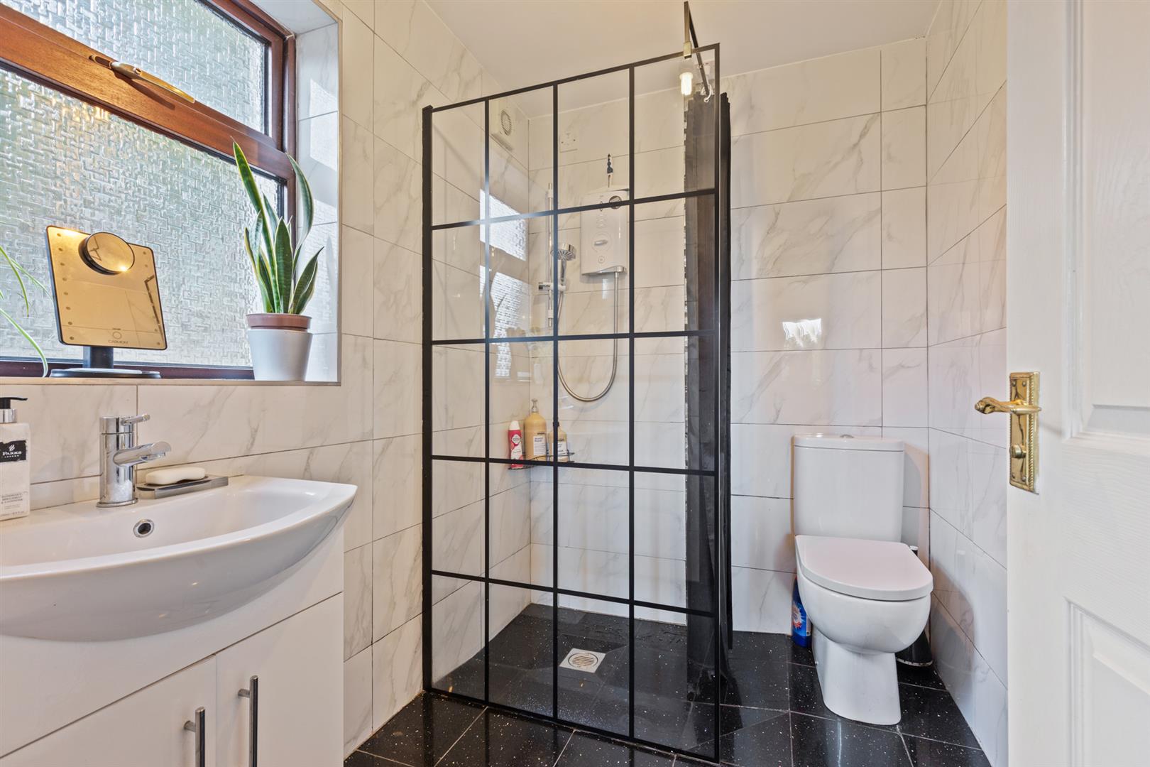 White suite comprising low flush w.c, wash hand basin and shower cubicle. Tiled floor and walls.