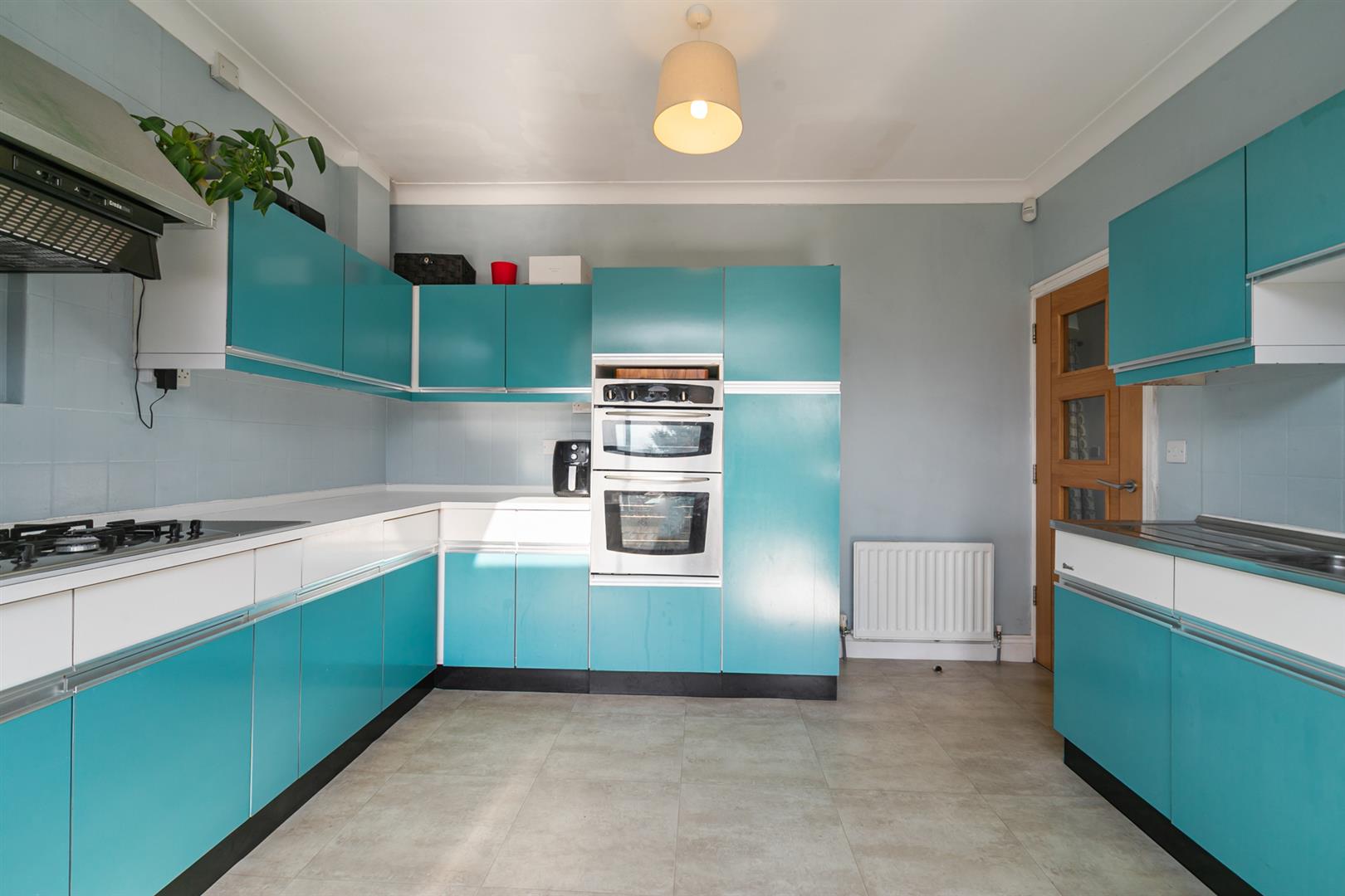 Range of high and low level units including double drainer stainless steel sink unit , recess for dish washer and fridge. Integrated oven and grill with four gas hobs, stainless steel cooker hood with extractor fan, tiled flooring.