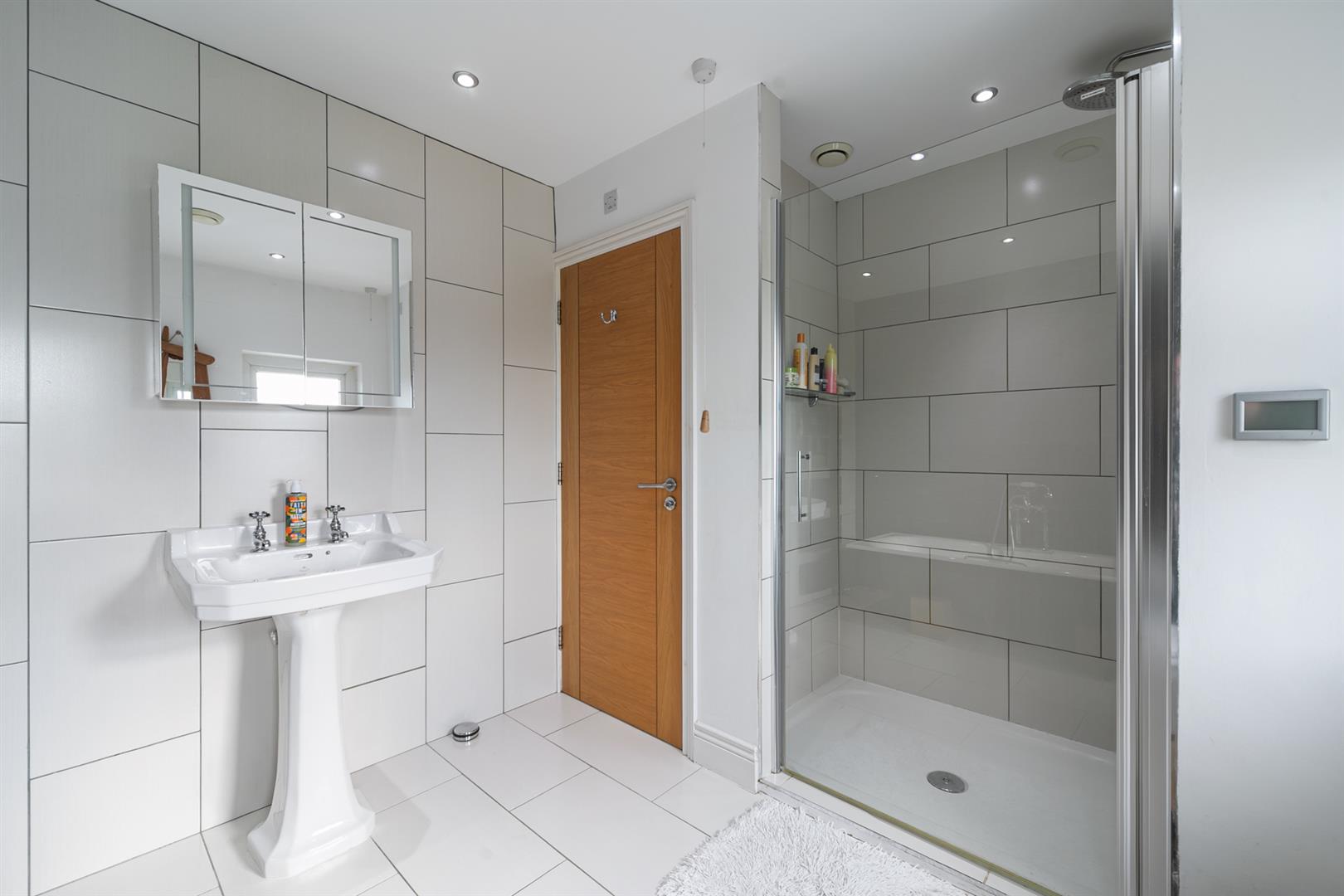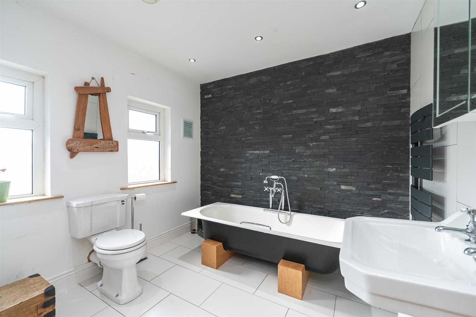 White suite comprising low flush WC, pedestal wash hand basin, free standing bath with 'telephone' shower fitting over. heated towel rail, tiled flooring and wall tiling. Walk in shower unit.