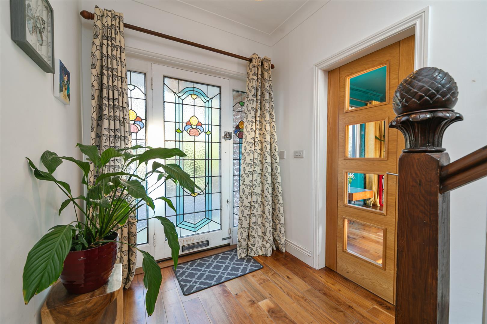 Leaded stain glass front door and side panels, solid wood flooring, stairs leading to first floor.