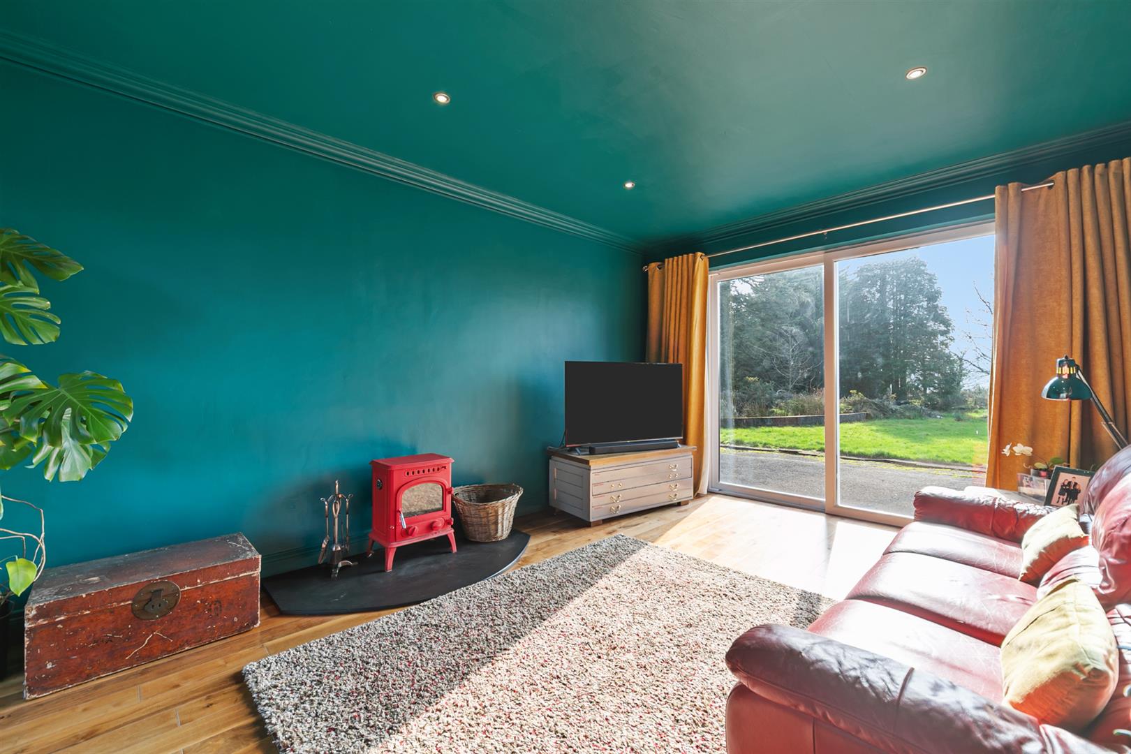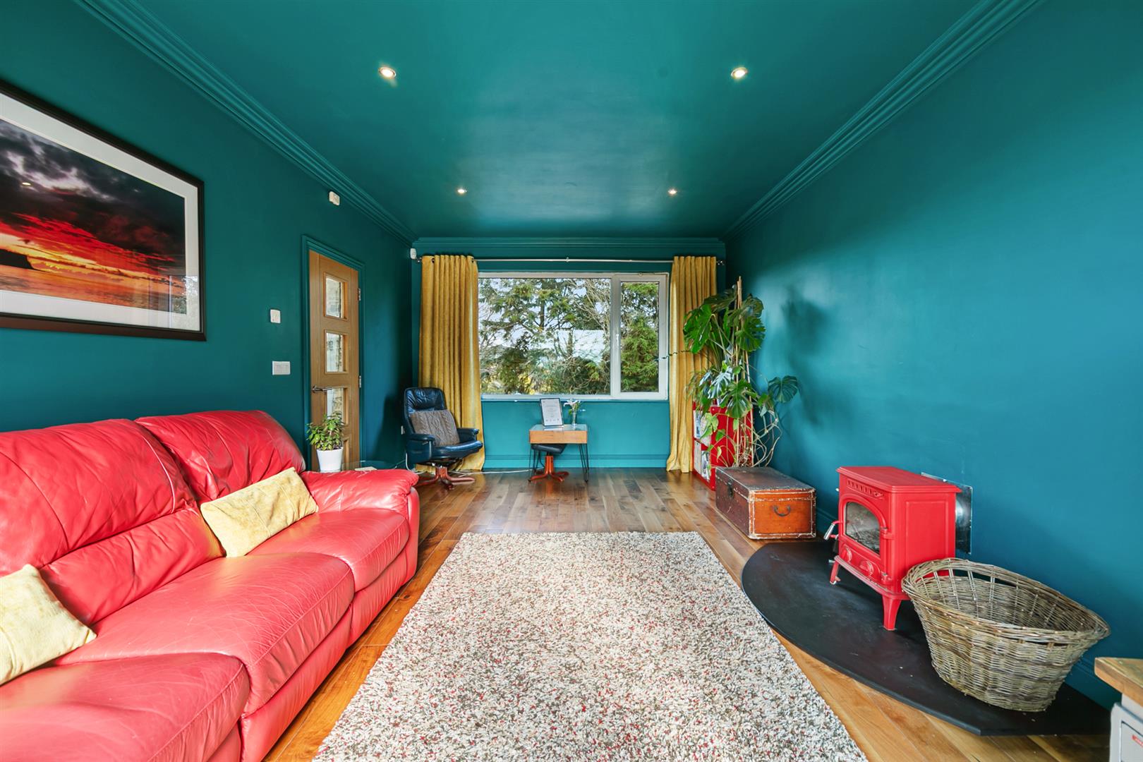 Wood flooring, wood burning stove, slate hearth, double doors to rear. Spot ceiling lights.