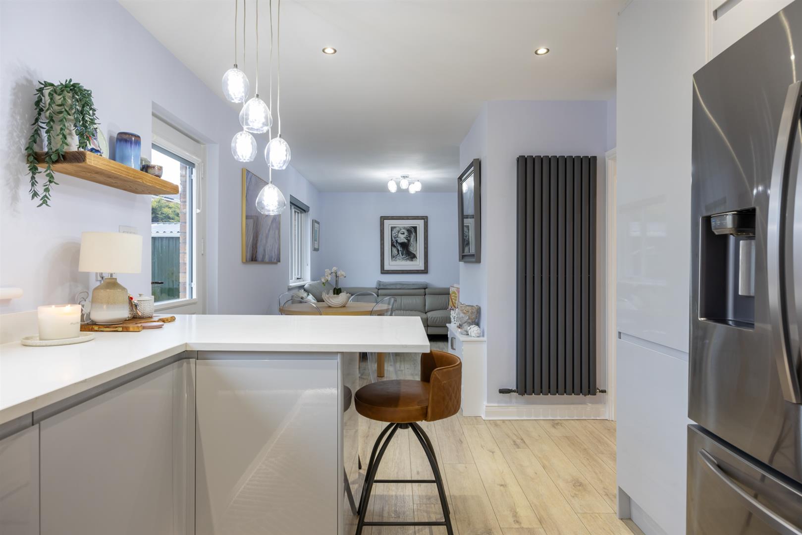 Contemporary style kitchen with a range of high and low rise units with Quartz work tops and integrated stainless steel sink with Quooker tap. Double electric oven and Neff electric hob with overhead stainless steel extractor fan and tiled splash back. Integrated dishwasher; space for American style fridge/freezer. Breakfast bar area for informal dining. Through to space for formal dining and seating area. Door to rear.