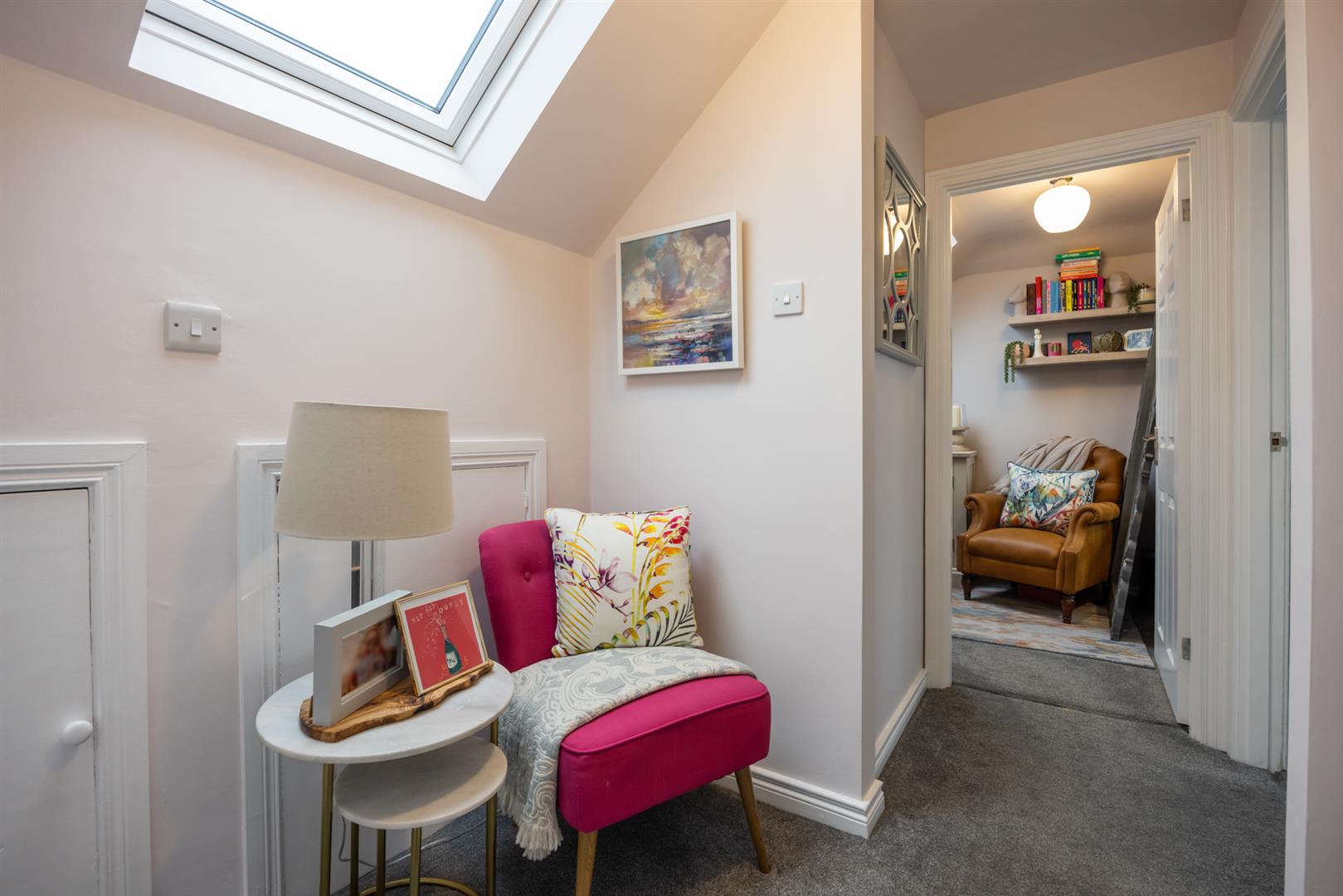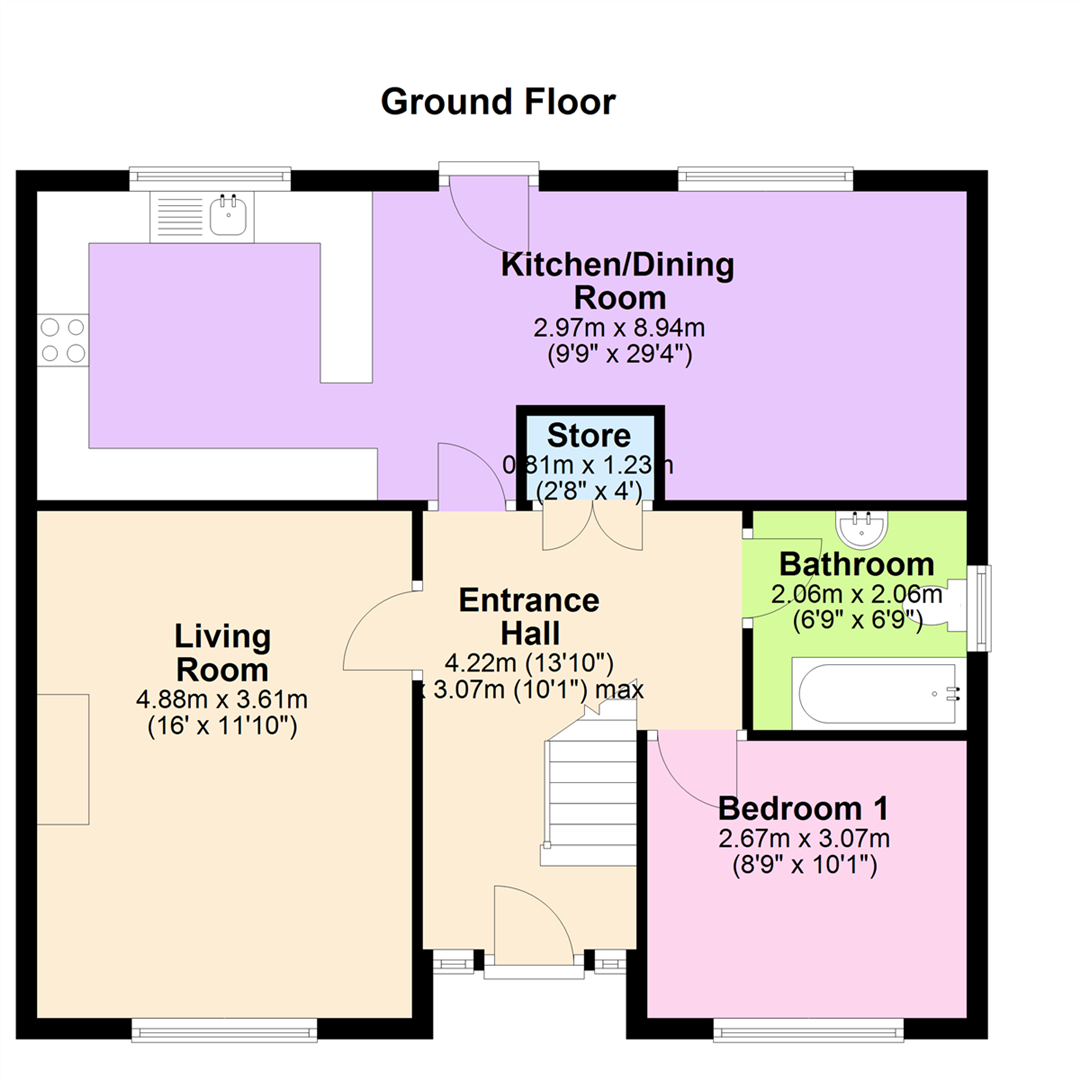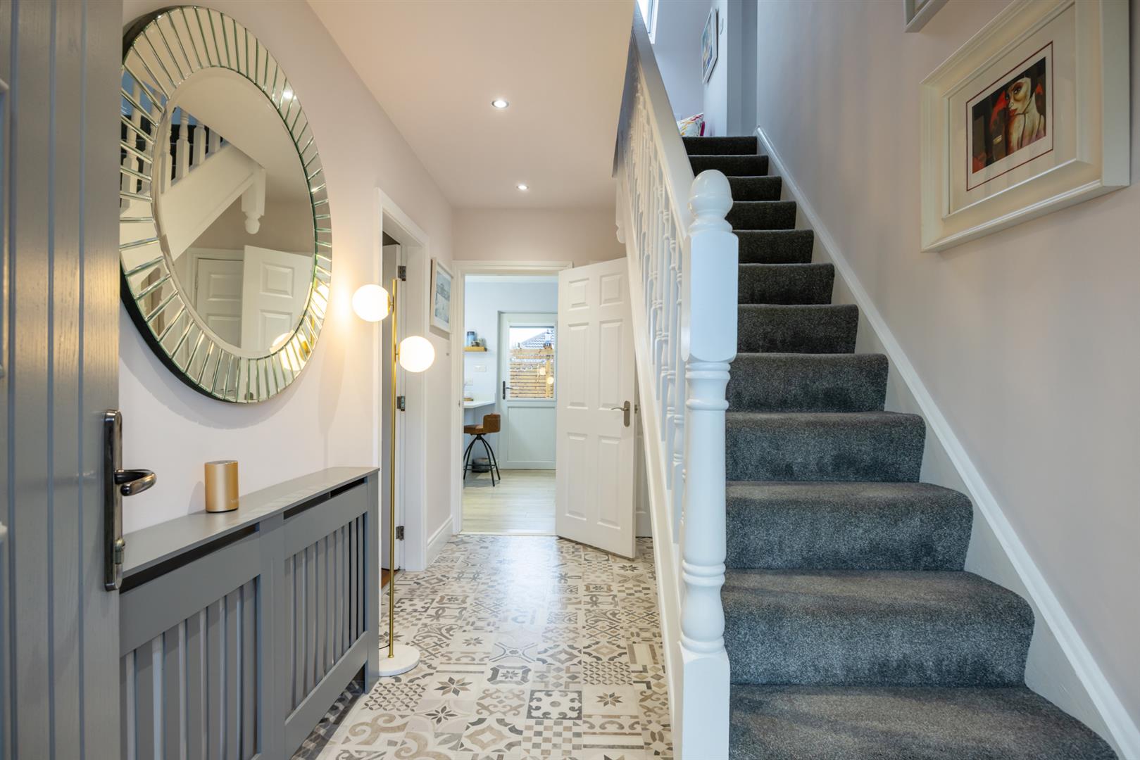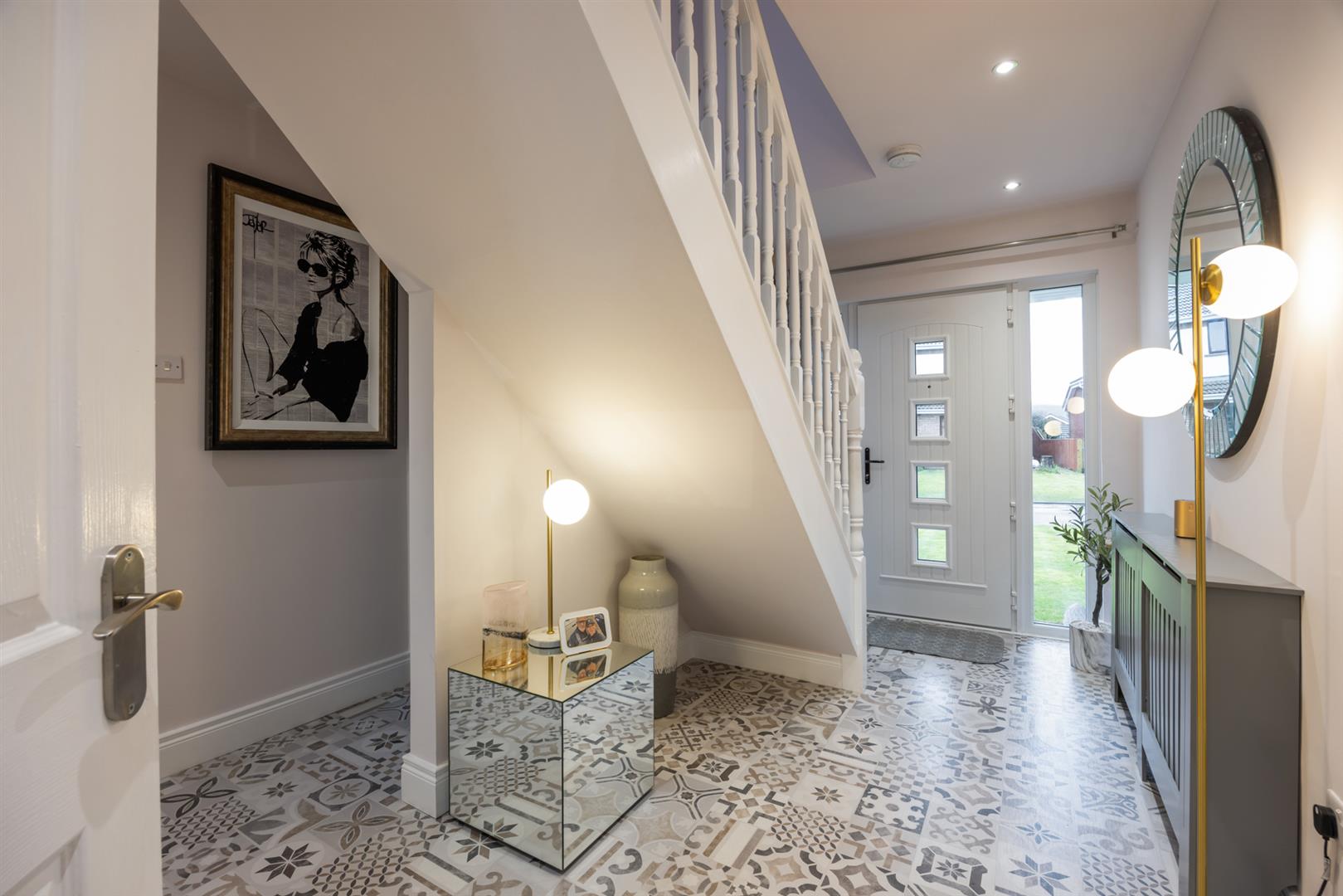 PVC glazed front door with side panel windows into bright entrance hall with feature tiled floor. Access to storage cupboard.