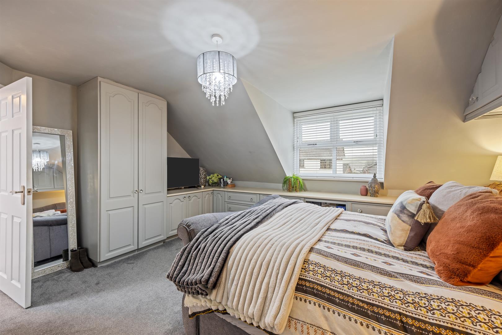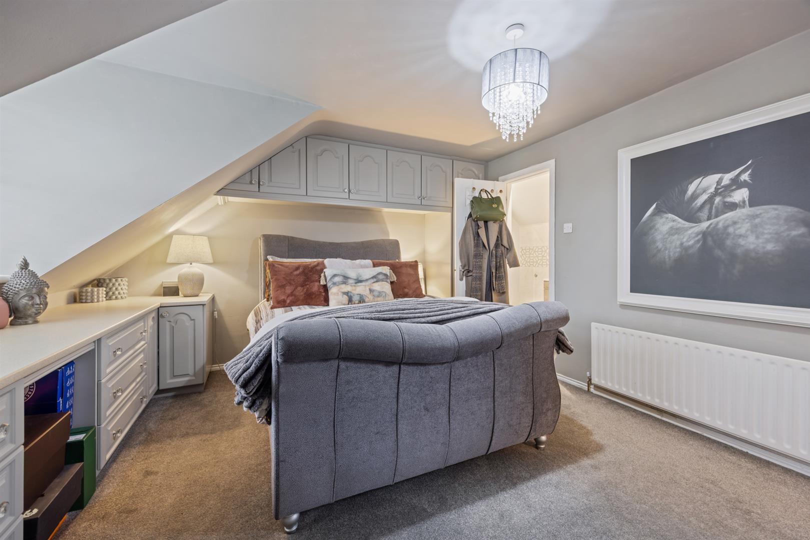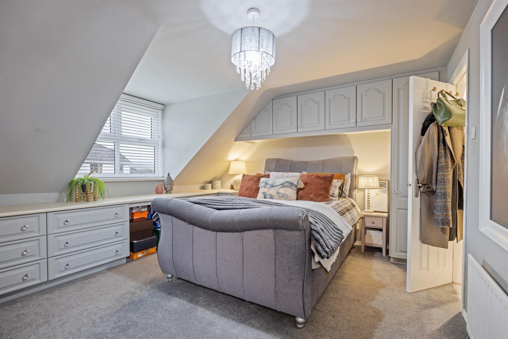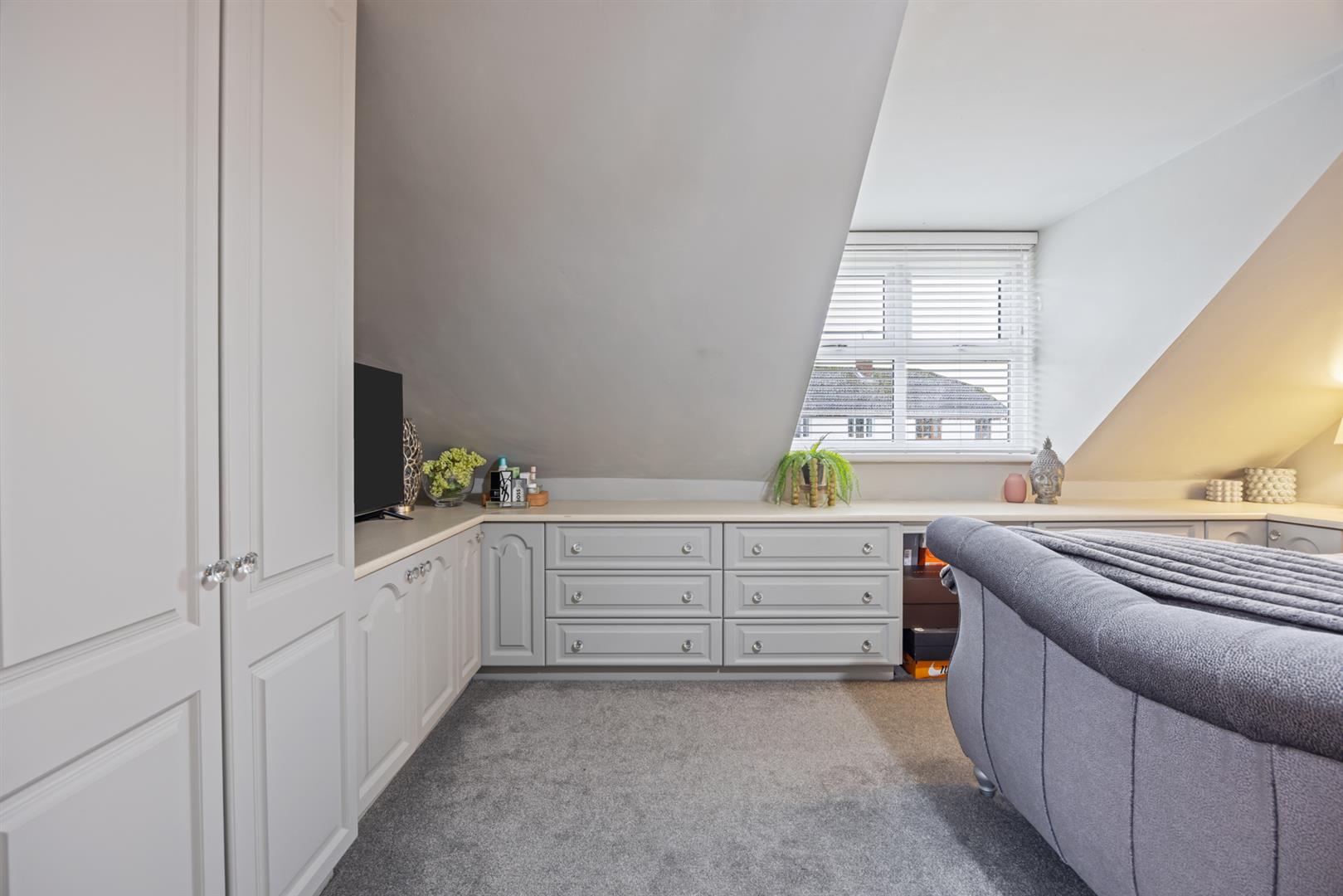 Master bedroom with range of built in storage units and wardrobes. Front facing.