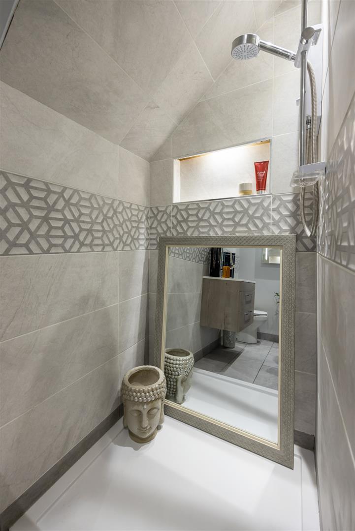 White suite encompassing low flush W/C, vanity wash hand unit and walk in shower. Towel radiator.