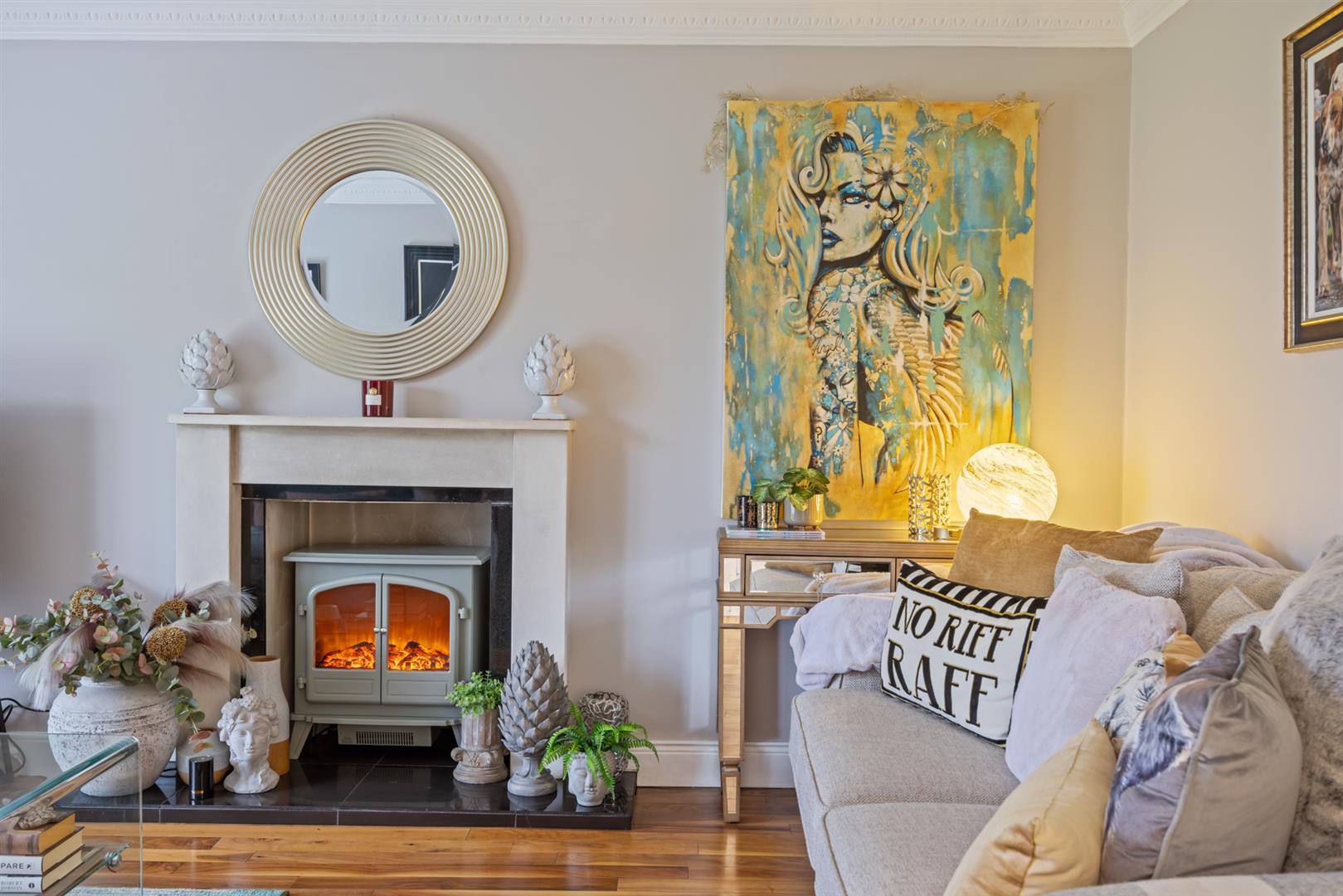 Bright and spacious living room with wooden flooring and feature fireplace with surround. Ceiling cornicing.