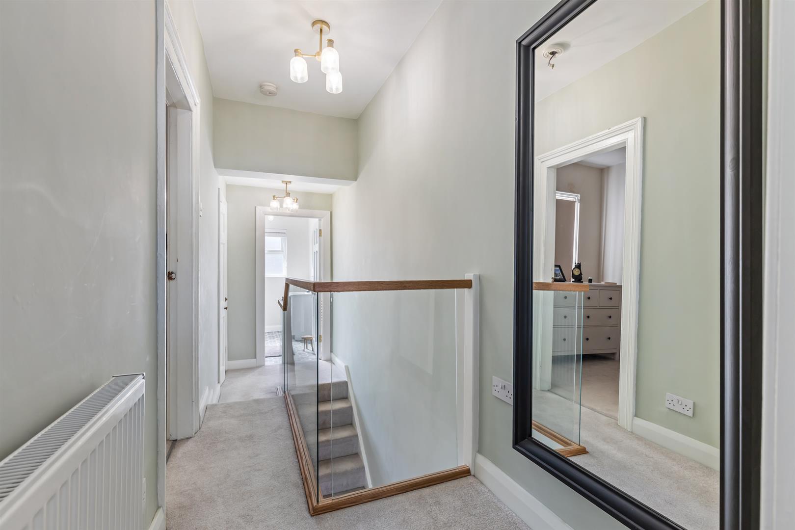 Stair case with feature glass baserail, leading to first floor. Fitted under stair storage.