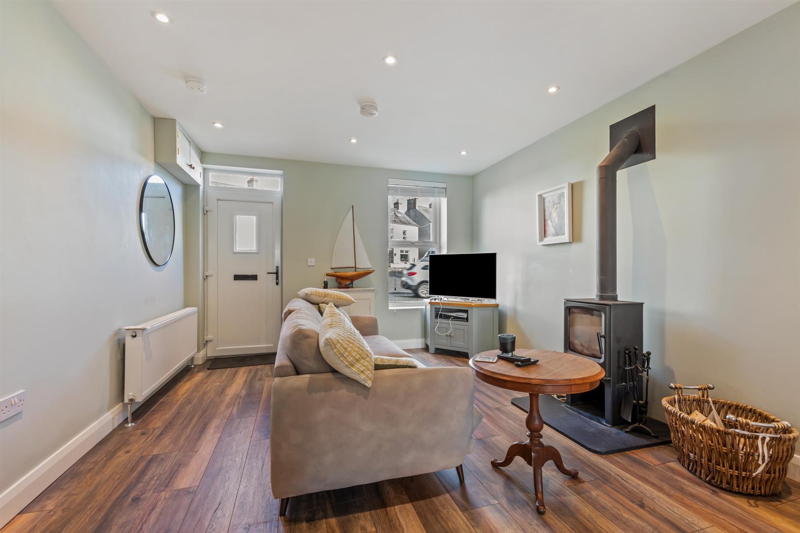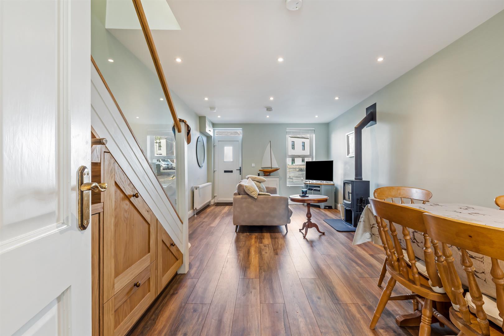 Living/Dining room with wood burning stove and slate hearth. Wood flooring. Window to front and rear, door leading to kitchen.