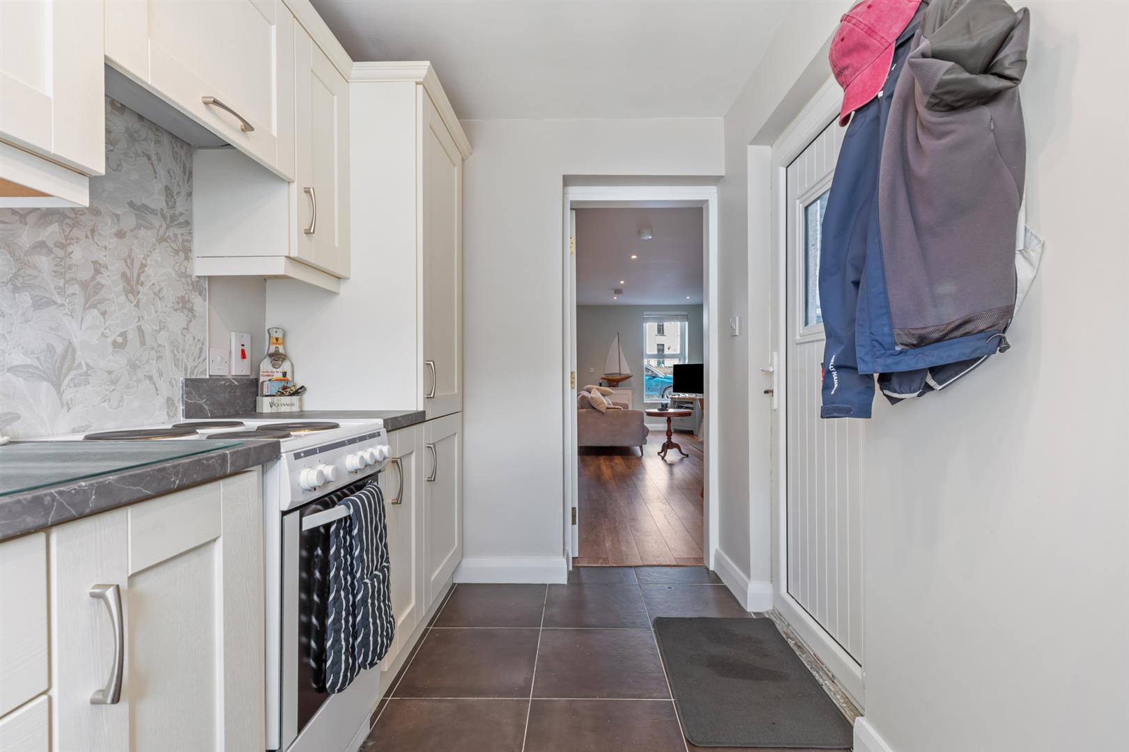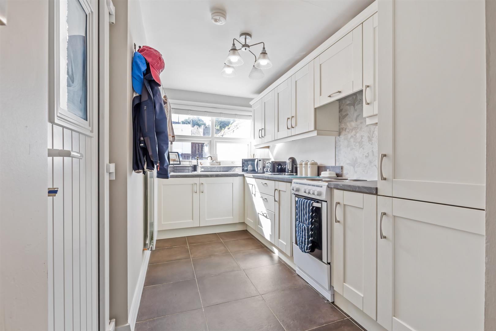 A range of high and low level units including an integrated fridge freezer and space for washing machine and oven. Stainless steel sink unit. Tiled flooring. Door to rear.