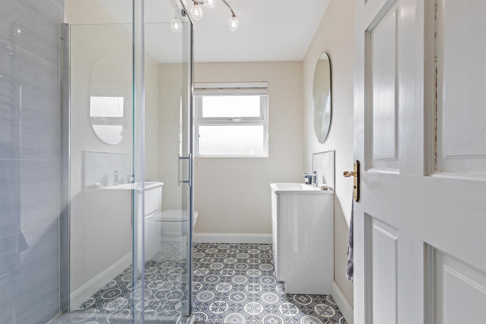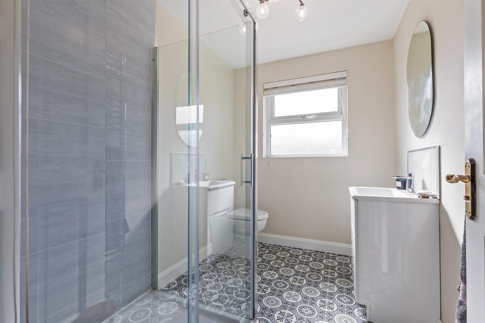 White suite comprising large tiled shower enclosure , vanity unit with wash hand basin, low flush w.c, tiled flooring