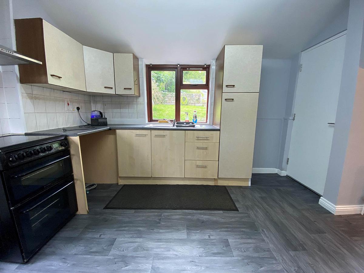 Kitchen with range of high and low level units. Cooker supplied, space for washing machine. Part tile walls, marble effect work surfaces and vinyl flooring.