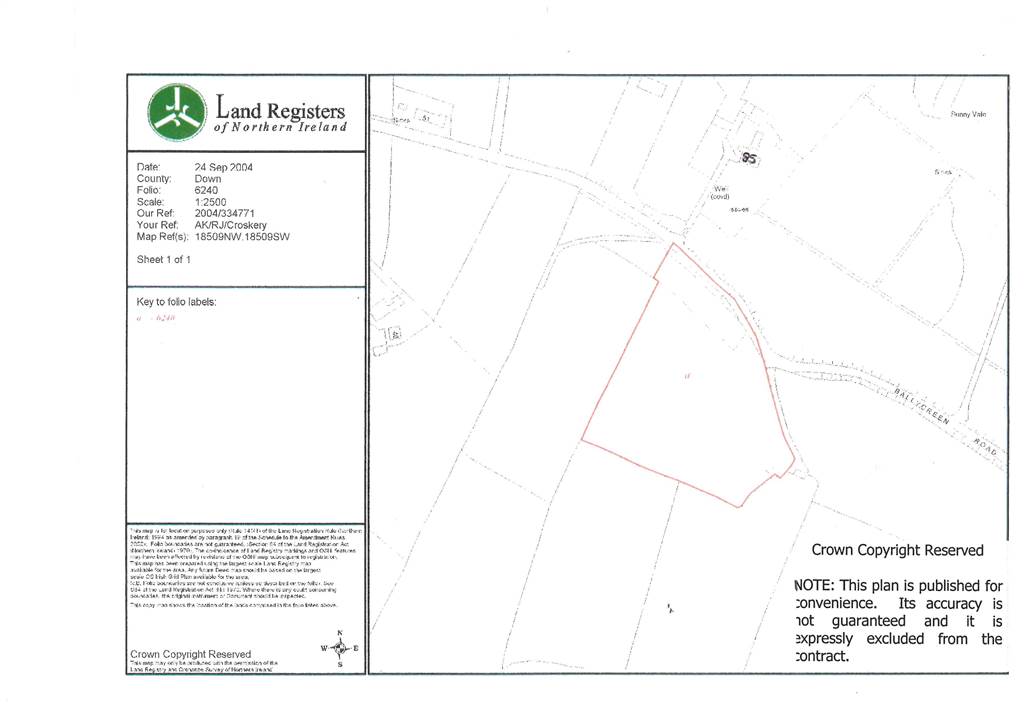 These lands front unto the Ballycreen Road and are contained within folio No.6240 Co.Down and contain 1.93 hectares (4.77 acres) and comprises of 4.12 acres of agricultural land presently in grass with the remainder being in mature trees. On the lands there are the remains of a stone building.