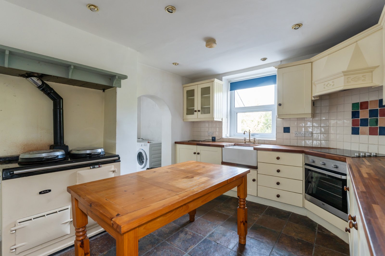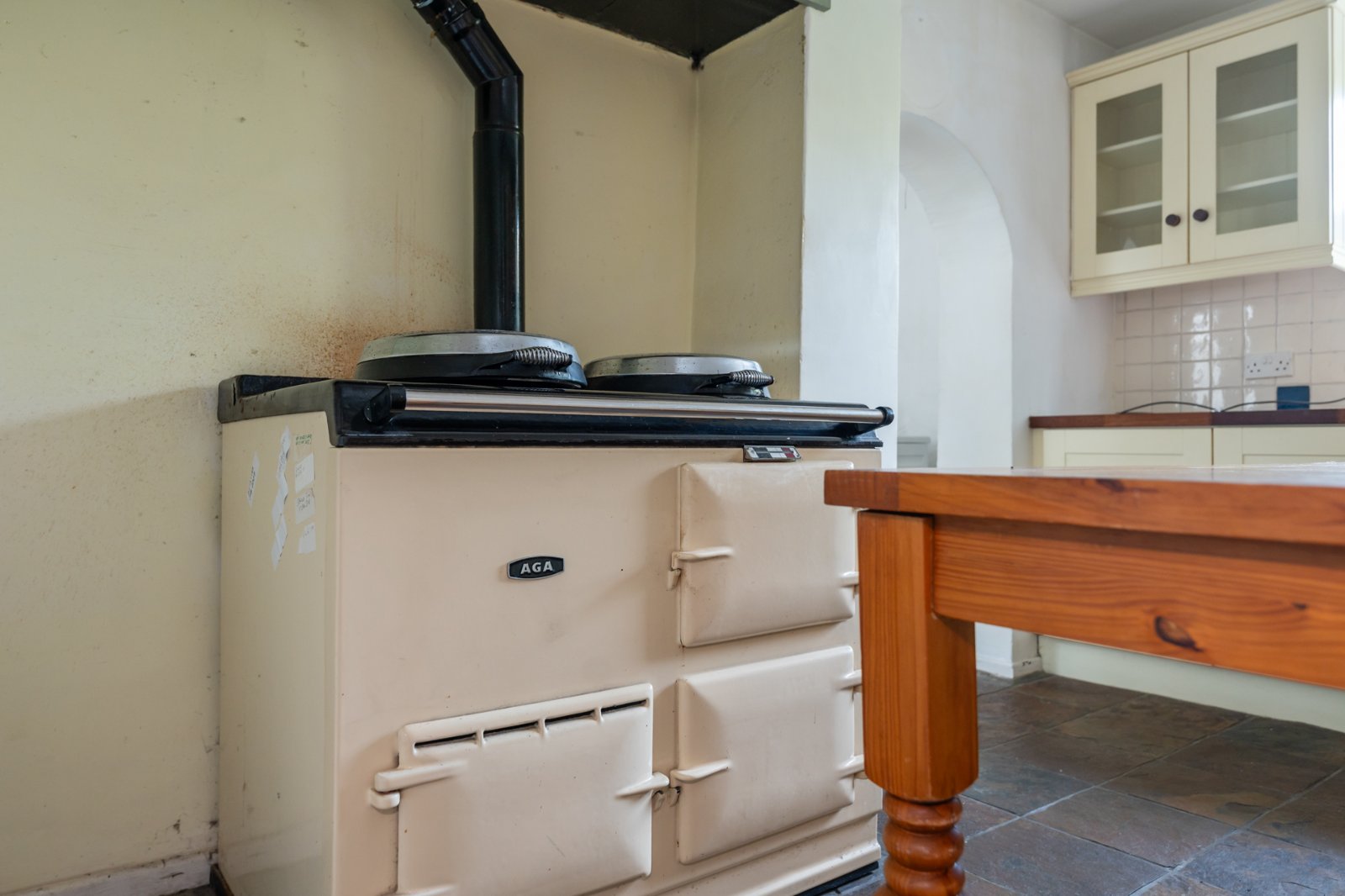 Range of high and low level units, old Belfast style sink unit, integrated stainless steel oven and four ring electric hob, extractor hood, picture rail, oil fired Aga