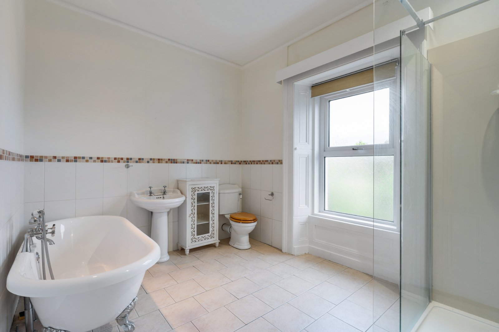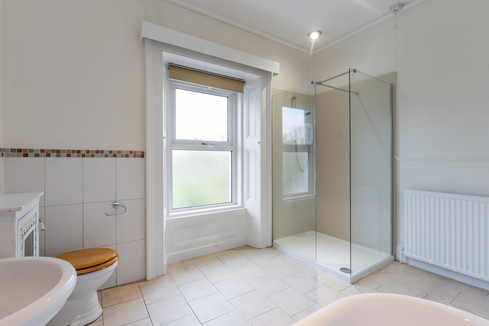Walk in double shower tray with Triton electric shower, WC, wash hand basin, freestanding bath with ball and claw feet
