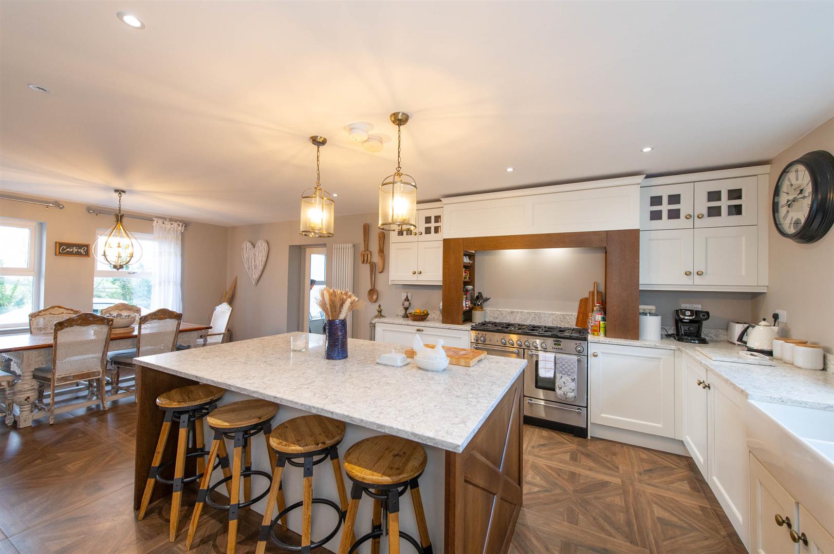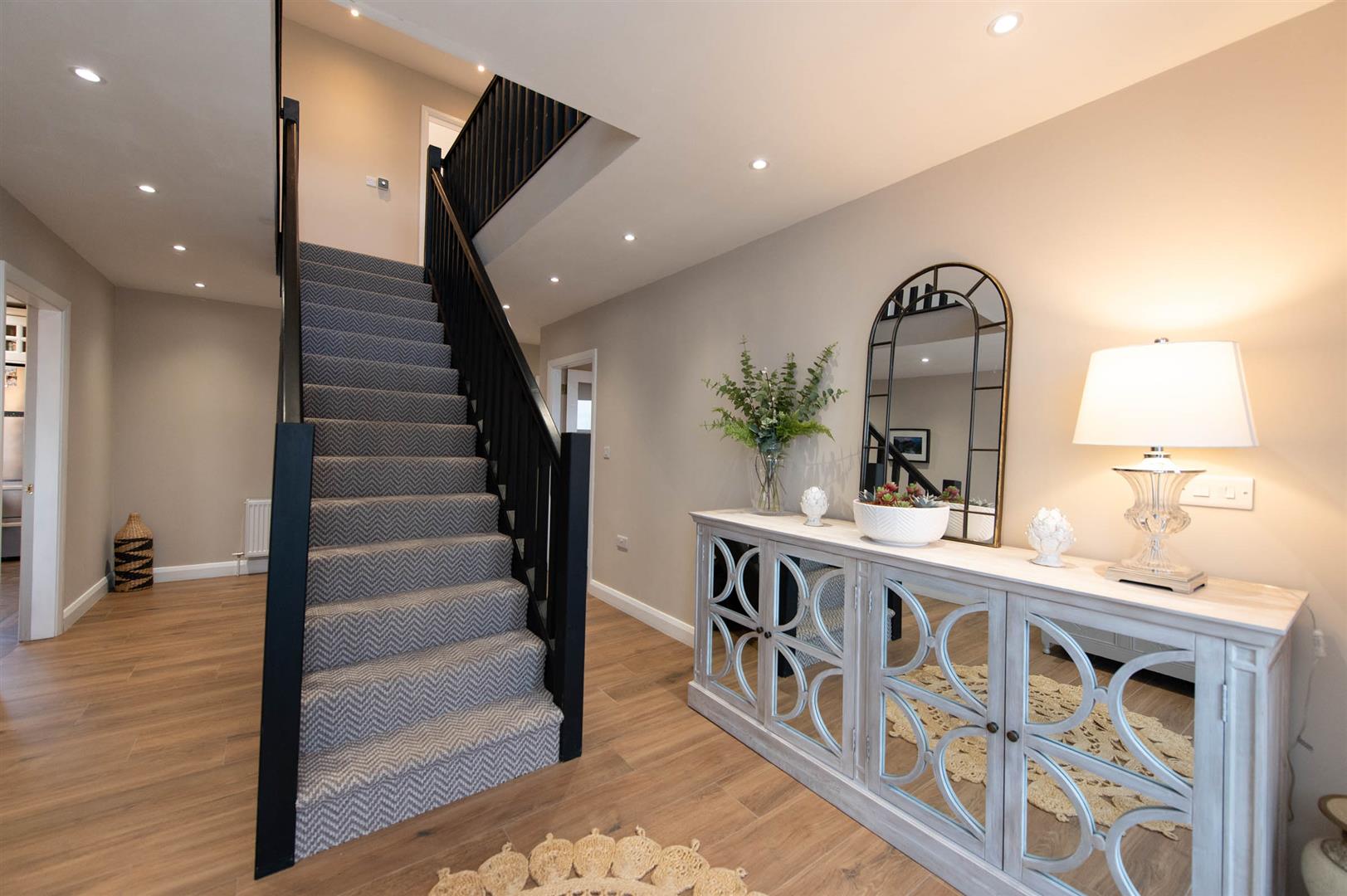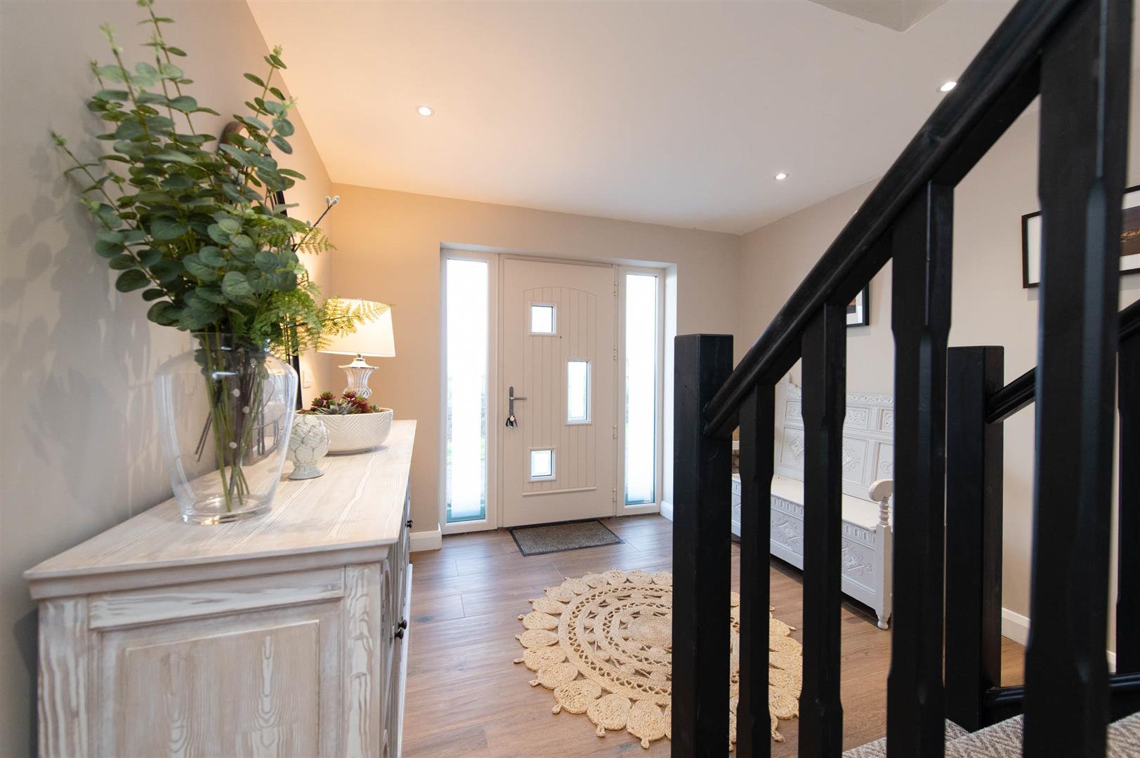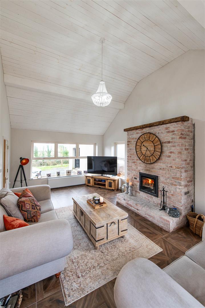 The property comprises bright spacious reception hall with featured gallery landing, to the left of the hall you enter the kitchen, dining area, sunroom and utility. The kitchen offers a range of high and low level units with featured centre island with storage, Belfast sink and recess for free standing gas stove and fridge freezer with ample space for a large dining table. The sunroom has a vaulted white wash wooden ceiling, brick-built fireplace with a wood-burning stove flanked by double-aspect windows and patio doors out to the garden. Leading back into the reception hall you can access a lounge area flooded with natural light through double facade windows, fourth bedroom currently being utilized as a home office and WC . The first floor offers three sizeable bedrooms, with primary suite to include built in wardrobes and ensuite with dual basin vanity and frameless glass walk-in walk in shower. The family bathroom boosts a free standing bath with separate shower.