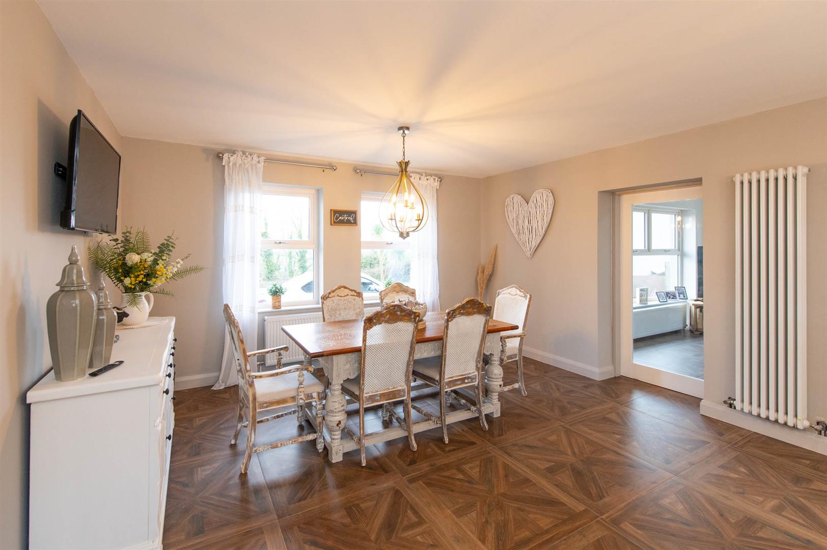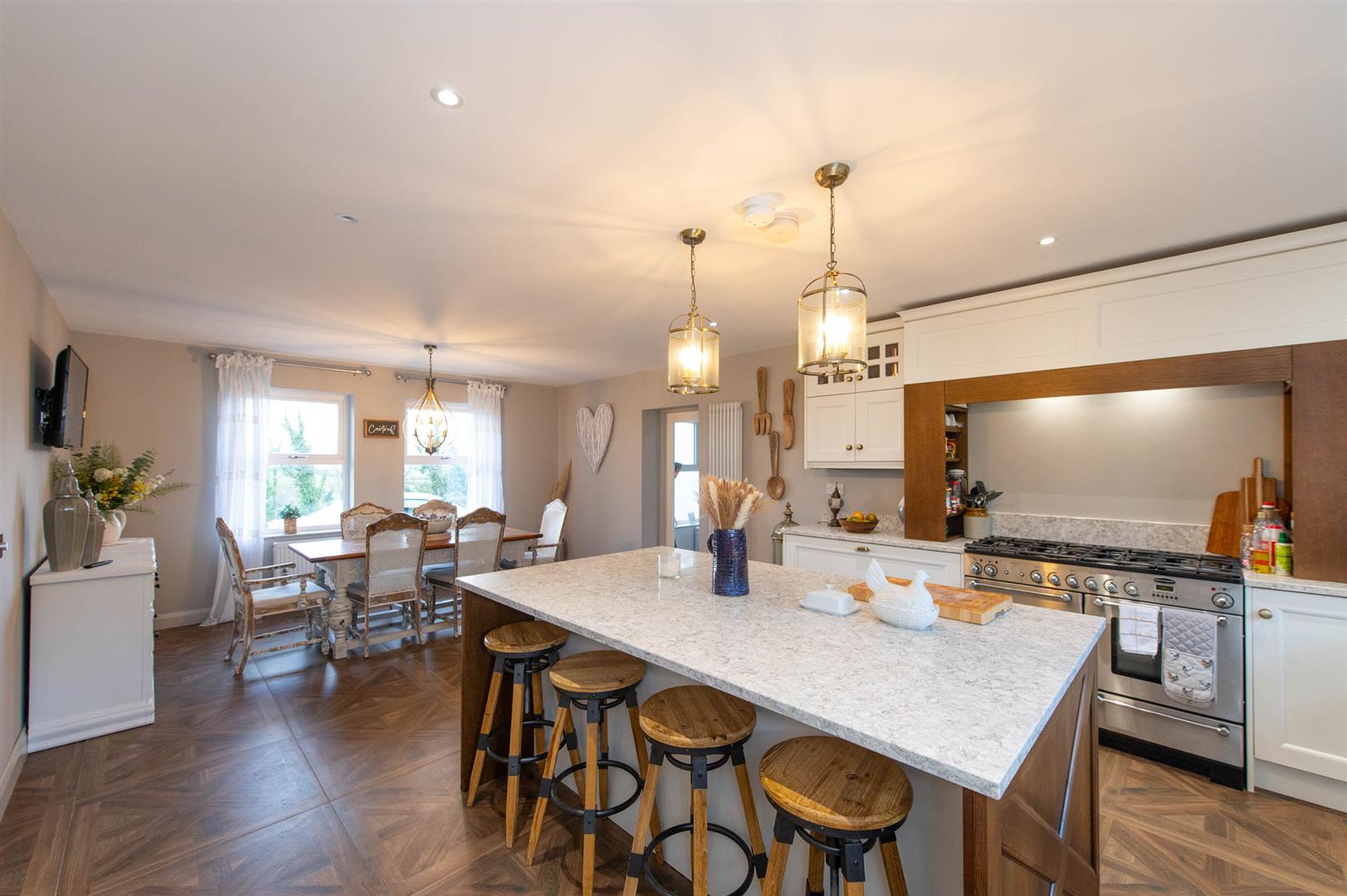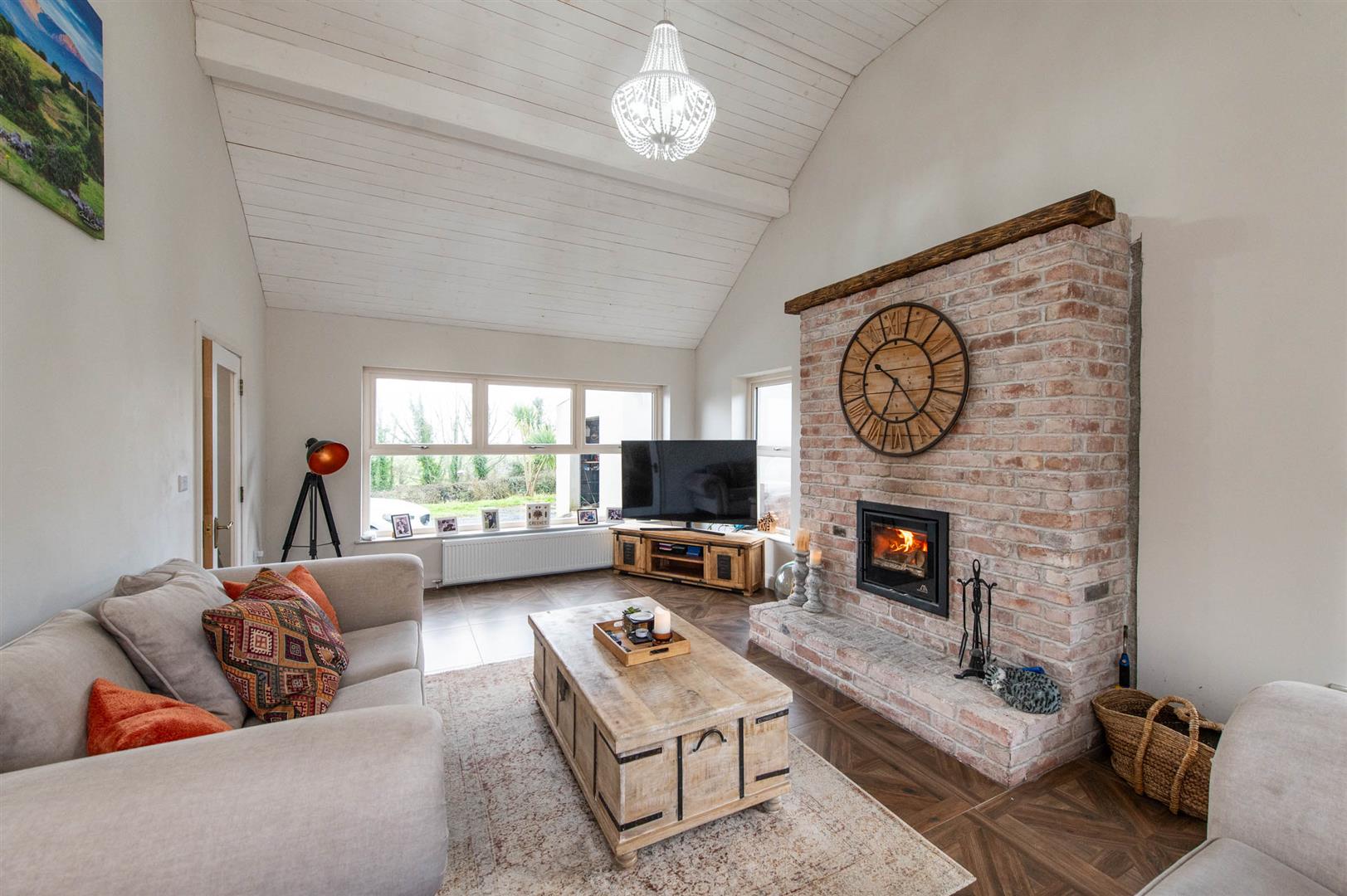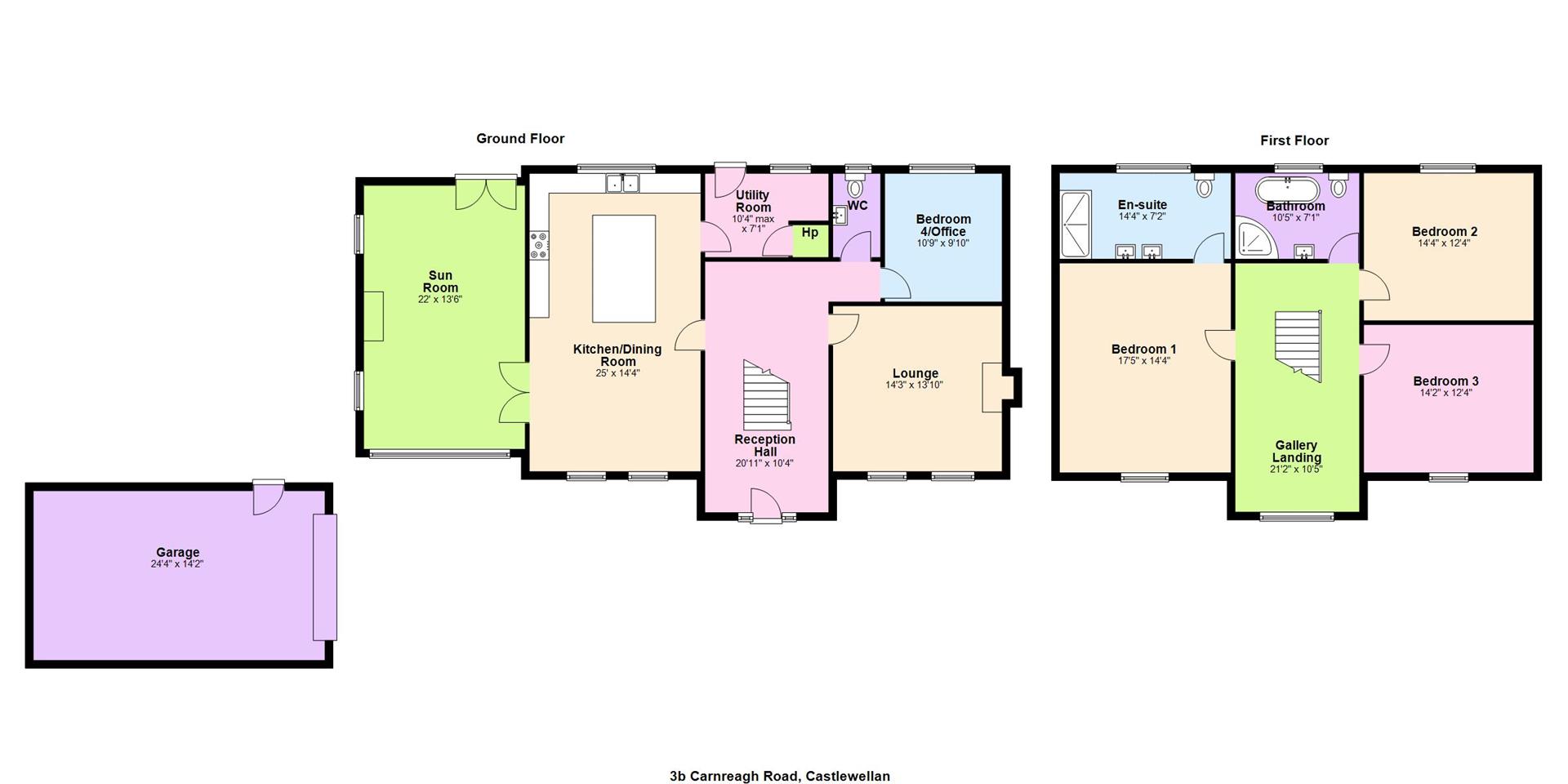 The property comprises bright spacious reception hall with featured gallery landing, to the left of the hall you enter the kitchen, dining area, sunroom and utility. The kitchen offers a range of high and low level units with featured centre island with storage, Belfast sink and recess for free standing gas stove and fridge freezer with ample space for a large dining table. The sunroom has a vaulted white wash wooden ceiling, brick-built fireplace with a wood-burning stove flanked by double-aspect windows and patio doors out to the garden. Leading back into the reception hall you can access a lounge area flooded with natural light through double facade windows, fourth bedroom currently being utilized as a home office and WC . The first floor offers three sizeable bedrooms, with primary suite to include built in wardrobes and ensuite with dual basin vanity and frameless glass walk-in walk in shower. The family bathroom boosts a free standing bath with separate shower.