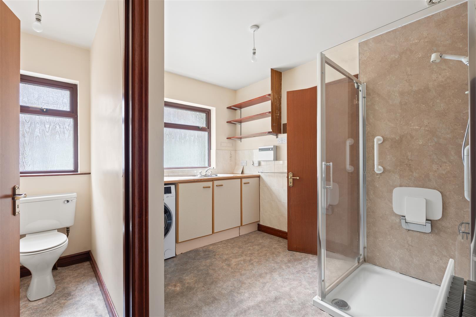 Single drainer stainless steel sink unit with mixer taps with cupboards under; laminate worktops; space and plumbing for washing machine; part tiled walls; shower cubicle with Aqualisa thermostatically controlled shower unit and wall mounted telephone shower attachment; fitted glass shower door and side panel; separate wc with low flush wc; extractor fan.