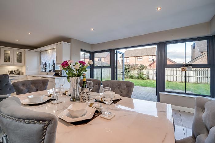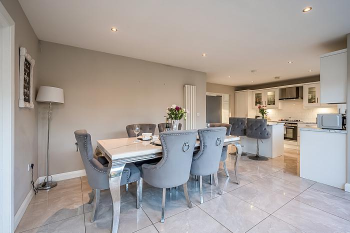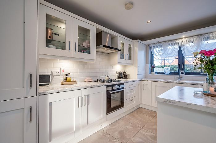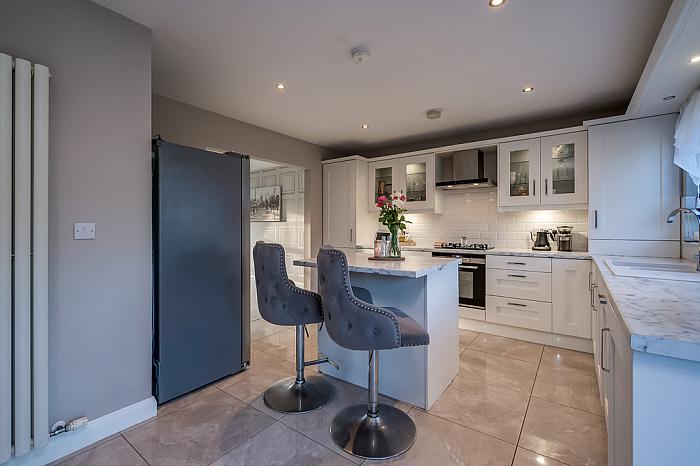 High gloss ceramic tiled floor, High and low level units, Marble effect worktop, Integrated oven, Integrated gas hob, Chrome extractor hood, Composite sink with drainer, Integrated dishwasher, Kitchen island with breakfast bar and wine fridge, Tiled splashback, recessed spotlights, uPVC double glazed window, Space for fridge freezer, Gas boiler.