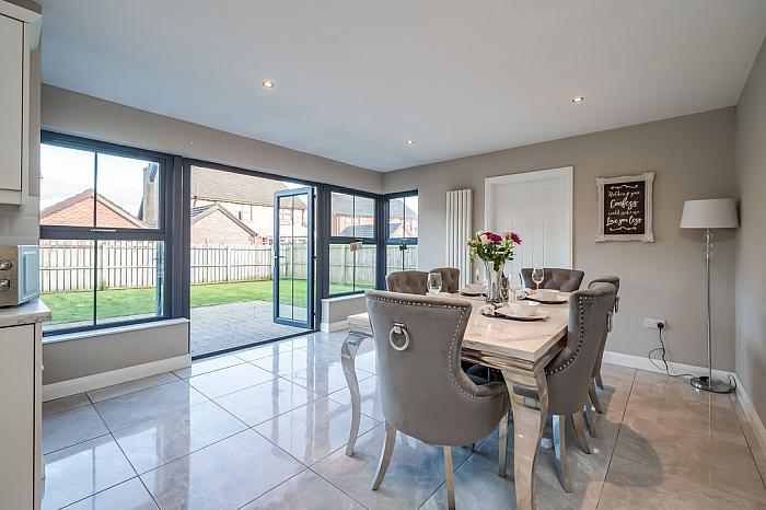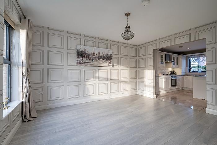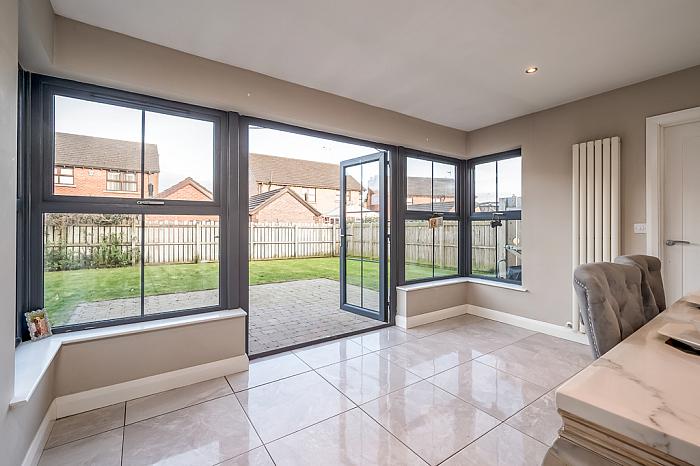 High gloss ceramic tiled floor, Vertical radiators x 2, uPVC French Doors, uPVC double glazed windows, Recessed spotlights.