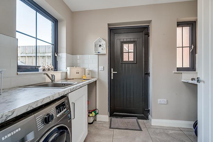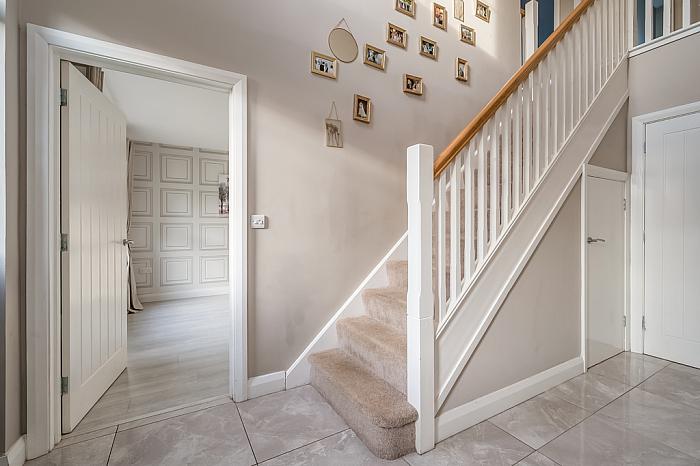 Ceramic tiled floor, Double panel radiator, Composite door, Under-stair storage.