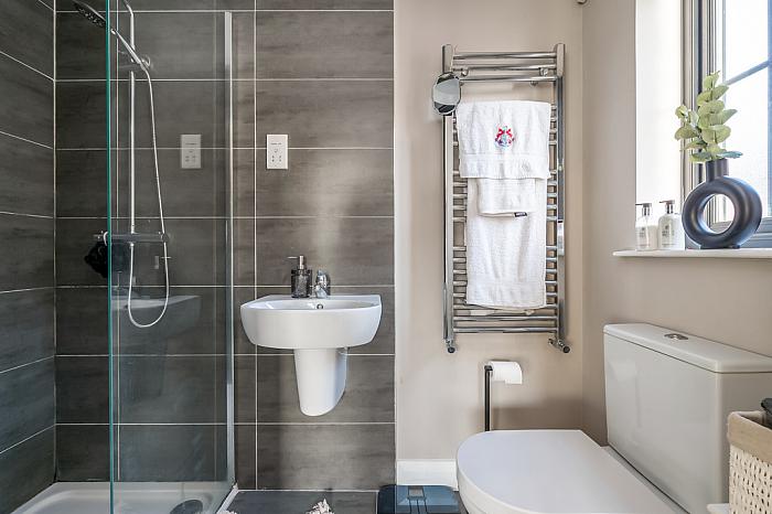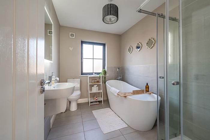 Ceramic tiled floor, Partially tiled walls, Freestanding bath, Freestanding bath tap with shower mixer, Twin flush WC, Wall hung basin, Shower tray, Sliding door shower enclosure, Thermostatic valve shower, uPVC double glazed window, Chrome heated towel rail, Recessed spotlights, Extractor fan.