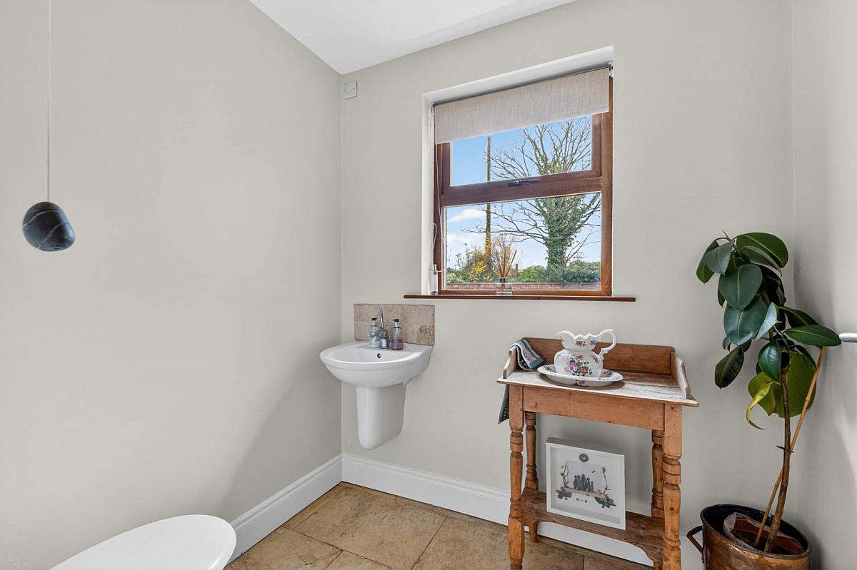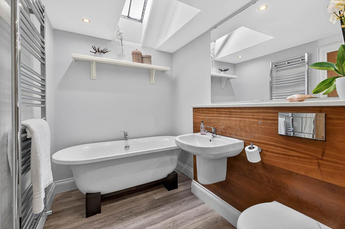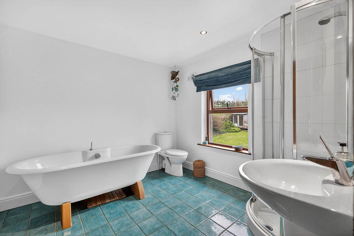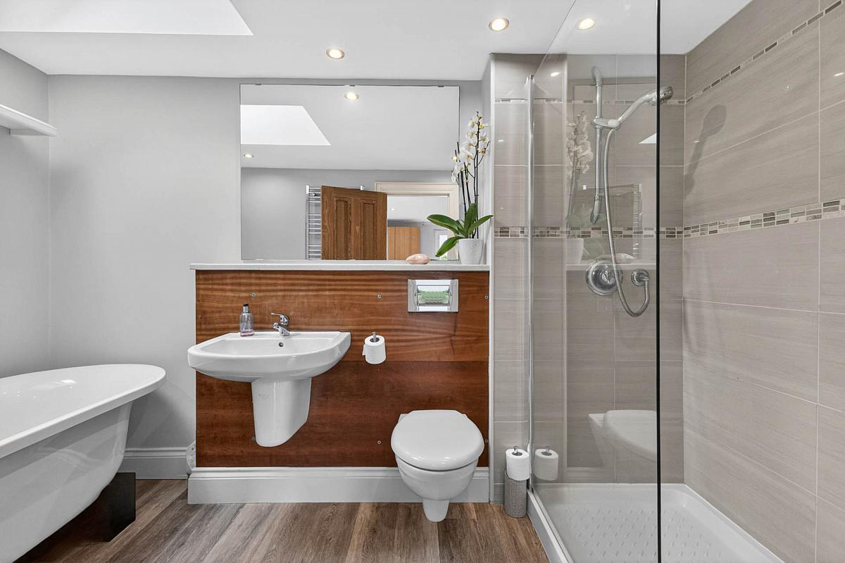 White suite comprising roll top free standing bath with centred mixer tap; floating wash hand basin with mixer tap; low flush w.c.; fully tiled shower cubicle. Tiled floor. Downlighters. Heated towel rail.
