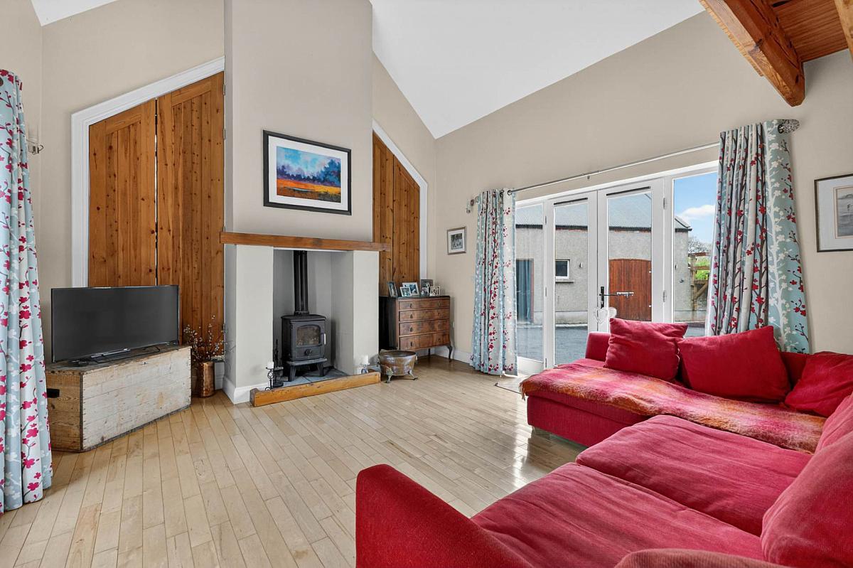 High vaulted ceiling. 'French' doors. Maple wooden flooring. Log burning stove on stone hearth with pine beam mantle. Feature tall windows either side of chimney breast with bespoke fitted pine shutters. 5 amp lighting sockets.