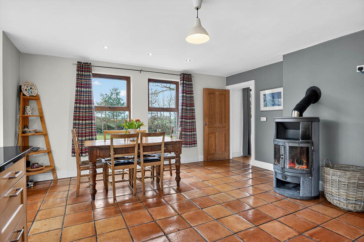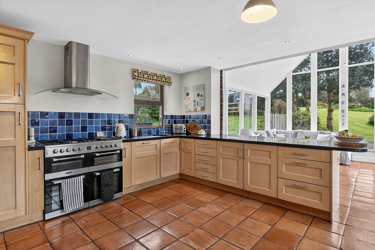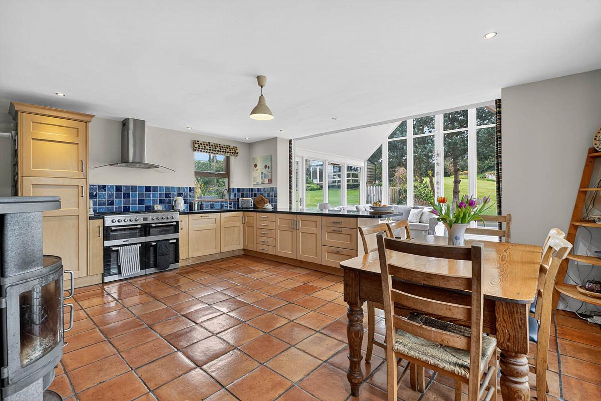 Range of 'Shaker' style units with granite worktops. Circular stainless steel sink unit with mixer tap. Part tiled walls. Breakfast bar. Integrated dishwasher. Range style cooker with extractor unit over. Downlighters. Terracotta tiled floor. Feature log burning stove. Open to:-
