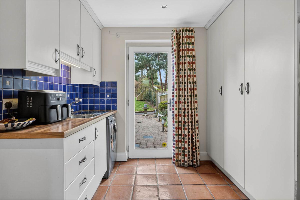 Range of cupboards. Single drainer stainless steel sink unit with mixer tap. Plumbed for washing machine. Terracotta tiled floor. Part tiled walls. Door to Integral Garage. Door to patio.