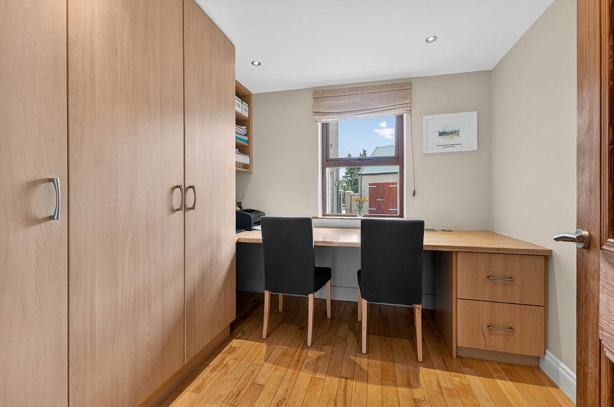 Maple wooden flooring. Downlighters. Fitted desk, shelving and cupboards.