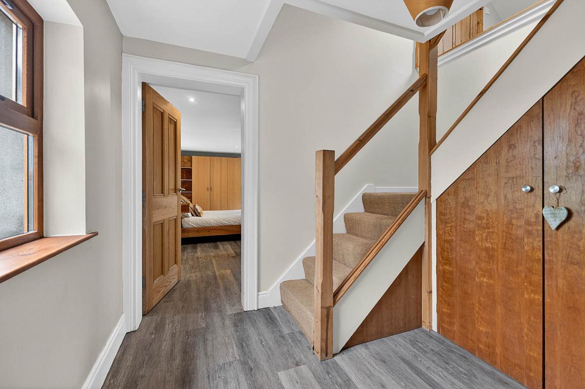 Limestone tiled floor. Ash stairs and under stairs storage cupboard.