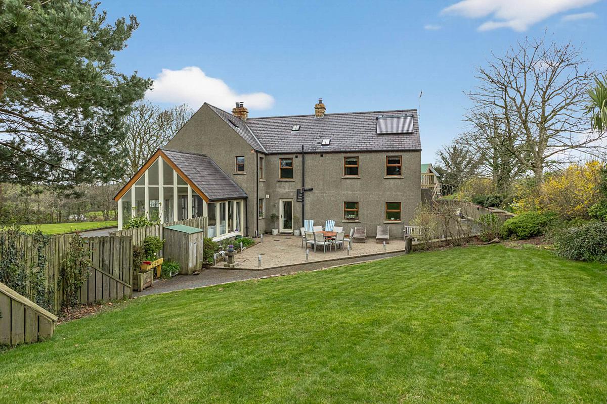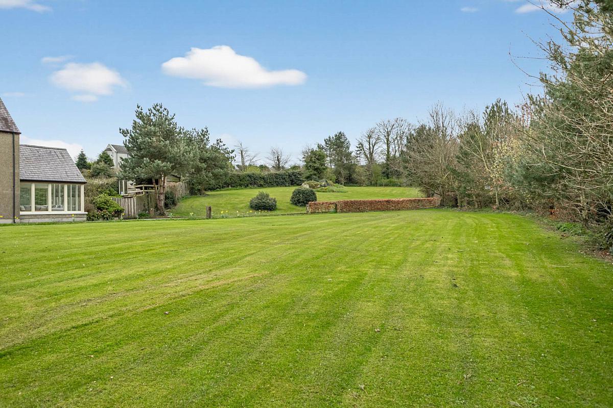 Approached via an impressive pillared entrance, a sweeping driveway winds through mature, landscaped gardens, offering ample parking and a strong sense of privacy. The grounds are laid primarily in lawn and enhanced by a variety of established native trees and shrubs.