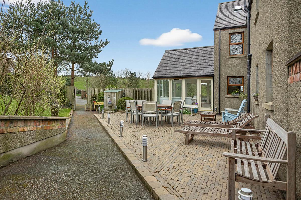 A cobble-paved patio is perfectly positioned to capture afternoon and evening sun, making it ideal for outdoor dining. A standout feature is the elevated larch-clad garden cabin, complete with log-burning stove, power, and lighting offering a unique space for entertaining, relaxation, or home working.