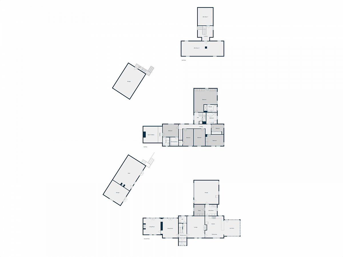 Upstairs, the accommodation continues to impress with six bedrooms, including a superb principal suite with en suite bathroom. A second bedroom benefits from a dressing room and en suite shower room. The remaining bedrooms are well-proportioned and served by a luxurious family bathroom featuring a freestanding roll-top bath and separate shower. Additional flexibility is provided by a games/play room and loft store.